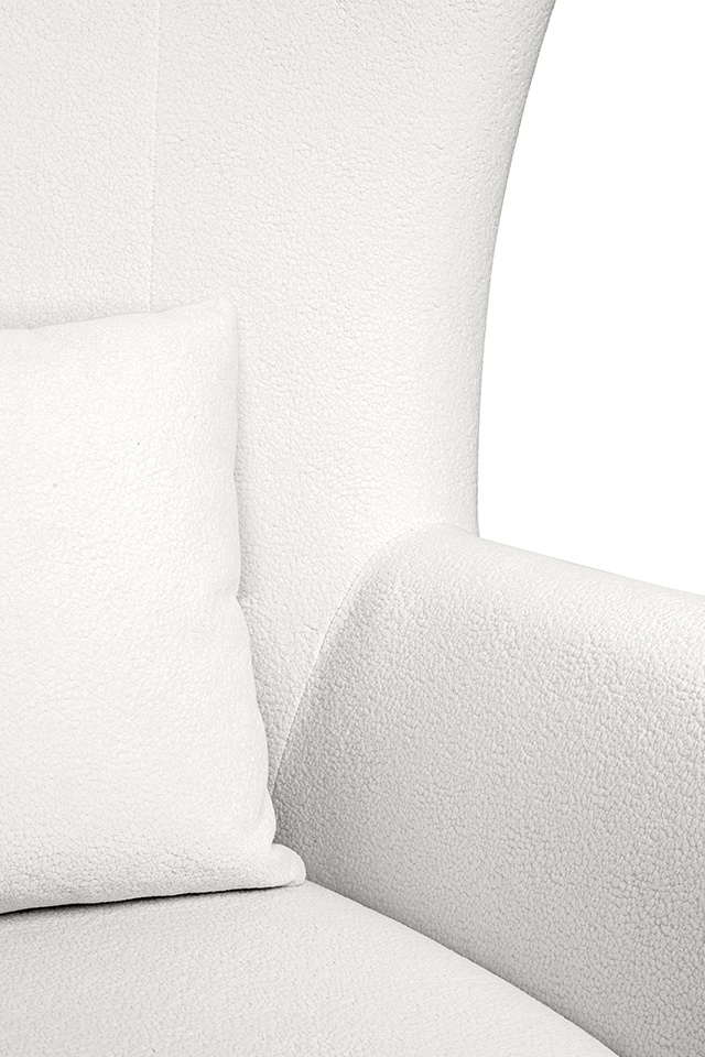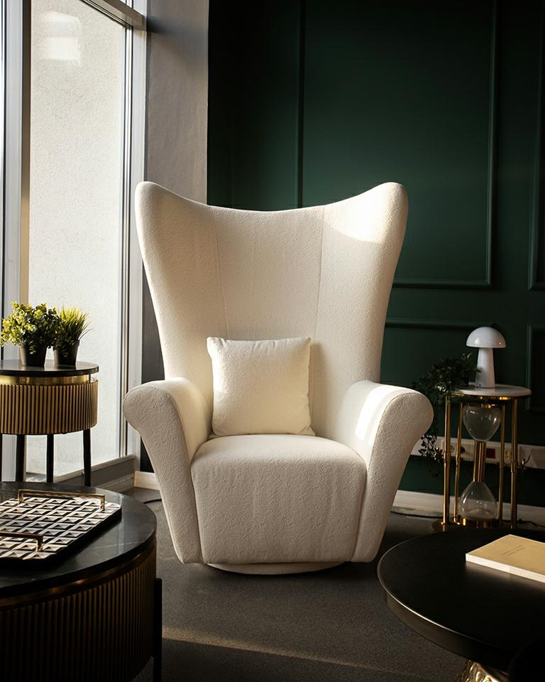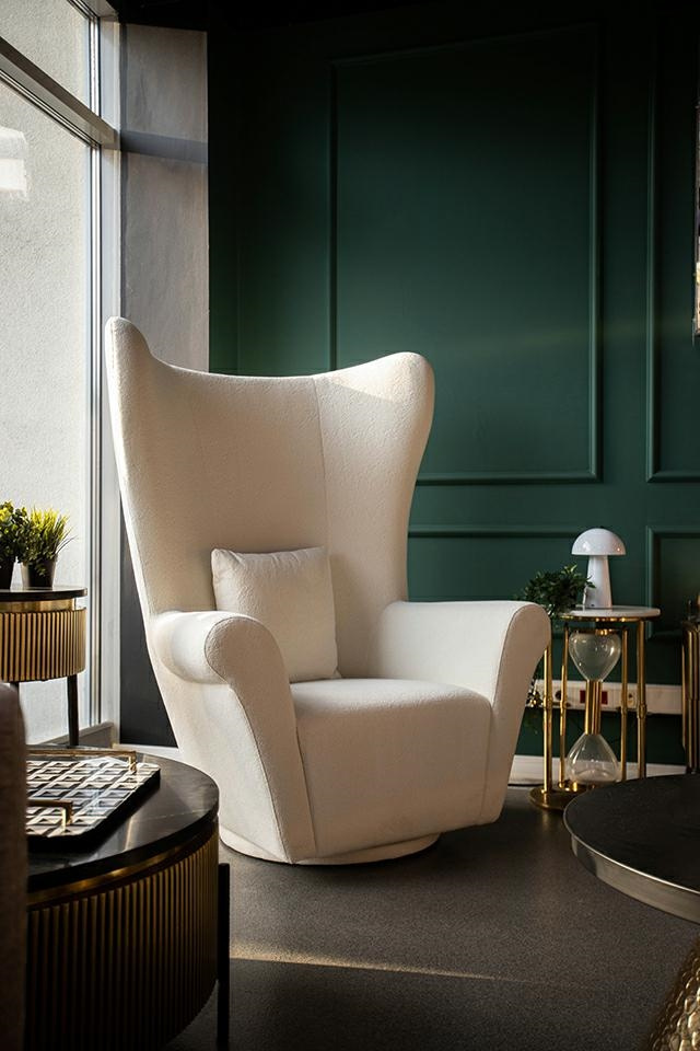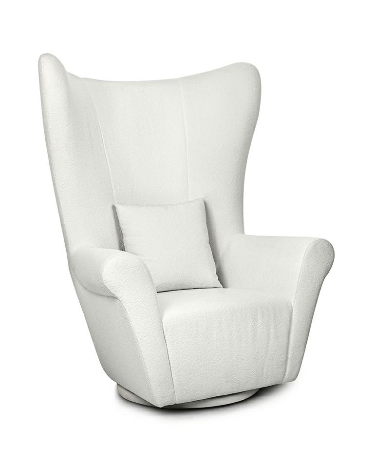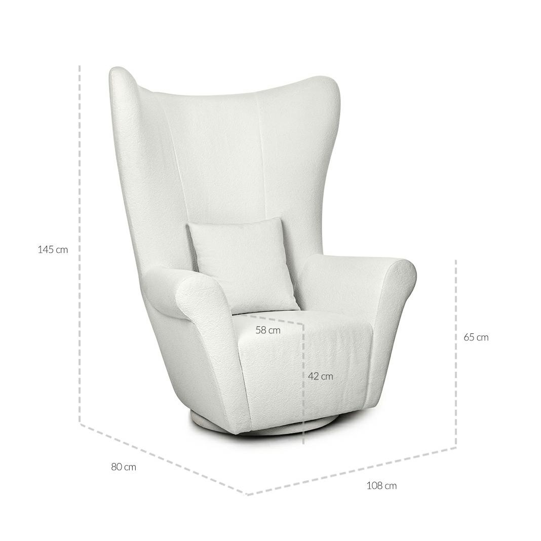 MaMaison fotel obrotowy GROSDOS biały / chenille. Elegancki fotel obrotowy, który wyróżnia się nowoczesnym designem i wysokim komfortem użytkowania. Kolor biały, wpadający delikatnie w krem, nadaje subtelnej elegancji, idealnej do jasnych i minimalistycznych wnętrz. Wykonany z przyjemnej w dotyku tkaniny szenilowej, zapewnia wyjątkowe uczucie komfortu podczas odpoczynku. Solidna konstrukcja łączy funkcjonalność z estetyką, oferując jednocześnie wygodne oparcie i miękkie podłokietniki. Fotel posiada praktyczną funkcję obrotową, co czyni go idealnym wyborem zarówno do salonu, jak i biura. Dodatkowym atutem jest dołączona dekoracyjna poduszka, która nie tylko zwiększa wygodę, ale także dodaje uroku całości. Grosdos to doskonały wybór dla osób ceniących styl i wygodę. Wymiary: wys. 145 cm / szer. 108 cm / gł. 80 cm Wysokość do krawędzi siedziska: 42 cm Siedzisko: szer. 58 cm / gł. 58 cm Wysokość do podłokietników: 65 cm Poduszka: 45x45x15 cm Waga: 40 kg.Cechy produktu