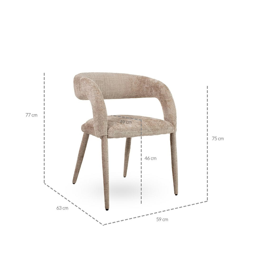 MaMaison krzesło IRIS beżowe. Propozycja dla miłośników subtelnej elegancji i komfortu. Otulone miękką tkaniną szenilową Davis Cremona 14 w ciepłym odcieniu beżu, zachwyca swoją delikatną strukturą i przyjemną w dotyku fakturą. Organiczna linia oparcia płynnie łączy się z podłokietnikami, tworząc spójną, harmonijną formę sprzyjającą relaksowi. Smukła podstawa nadaje konstrukcji lekkości. Iris świetnie doskonale odnajdzie się w eleganckiej jadalni, dodając wnętrzu przytulnego szyku. Wymiary: wys. 77 cm / szer. 59 cm / gł. 63 cm Wysokość do krawędzi siedziska: 46 cm Wysokość do podłokietników: 75 cm Siedzisko: szer. 46 cm / gł. 49 cm Oparcie: wys. 20 cm / szer. 44 cm Rozstaw nóg: przód 54 cm / tył 44 / gł. 45 cm Waga brutto: 13,4 kg Wymiary opakowania: 93 cm / 71 cm / 59 cm.