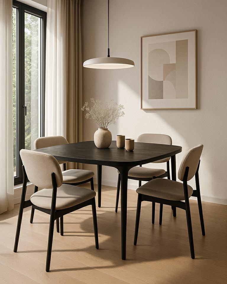 MaMaison stół jadalniany LAMINAR 120 czarny / drewno. Doskonały wybór dla miłośników wyrafinowanego minimalizmu i nowoczesnej formy. Wykonany z litego drewna mango i wykończony w eleganckiej czerni, zachwyca subtelną asymetrią i delikatnie zaokrąglonymi liniami. Smukła podstawa i organiczny kształt blatu nadają mu lekkości, dzięki czemu świetnie wpisuje się zarówno w przestrzenie nowoczesne, jak i bardziej eklektyczne. Model Laminar to część szerszej linii stołów – dostępnych w różnych formach i rozmiarach – które pozwalają stworzyć spójne i stylowe wnętrze. To mebel, który nie tylko zdobi, ale również doskonale spełnia swoją funkcję. Wymiary: wys. 76 cm / szer. 120 cm / gł. 120 cm Waga brutto: 45 kg.Cechy produktu