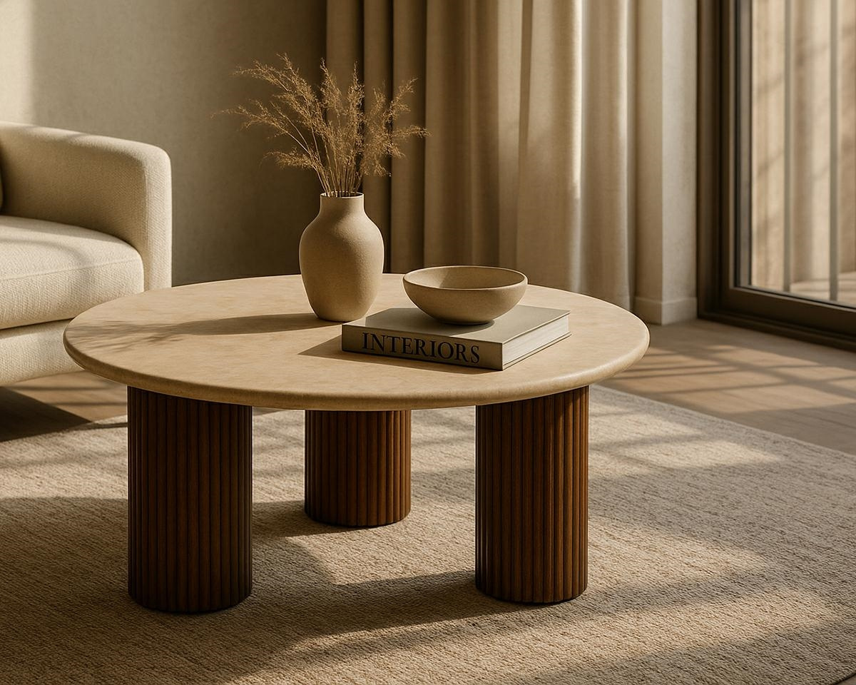 - MaMaison stolik kawowy RAGNO marmur / drewno. Elegancka propozycja o subtelnym, a jednocześnie wyrazistym charakterze. Blat wykonany z naturalnego marmuru Boto Chino przyciąga uwagę jasną, beżową tonacją i delikatnym rysunkiem kamienia. Stabilna, brązowa