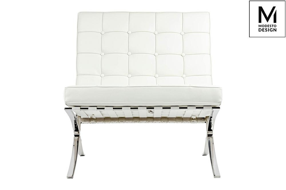 - Fotel Barcelon marki Modesto Design stanowi jednoosobową mini sofę, której szerokość 75 cm pozwala wygodnie się rozsiąść i wypocząć. Siedzisko jest na wysokości 46 cm i zostało wykonane w całości z ekoskóry w kolorze białym. Z kolei stelaż i nóżki fotela
