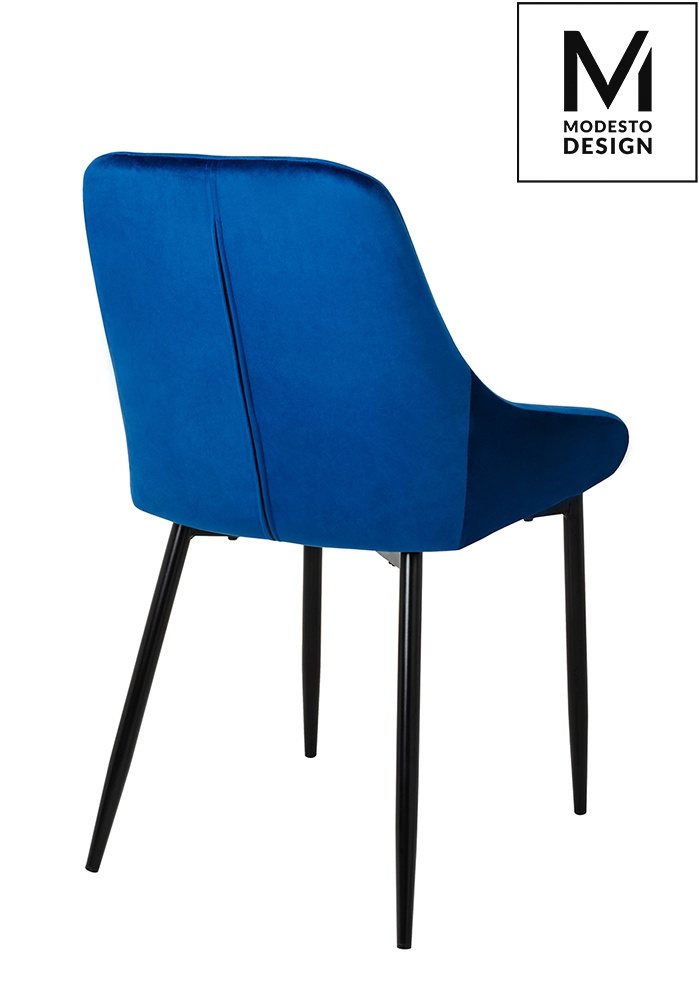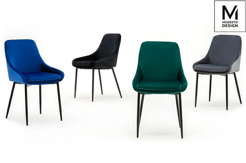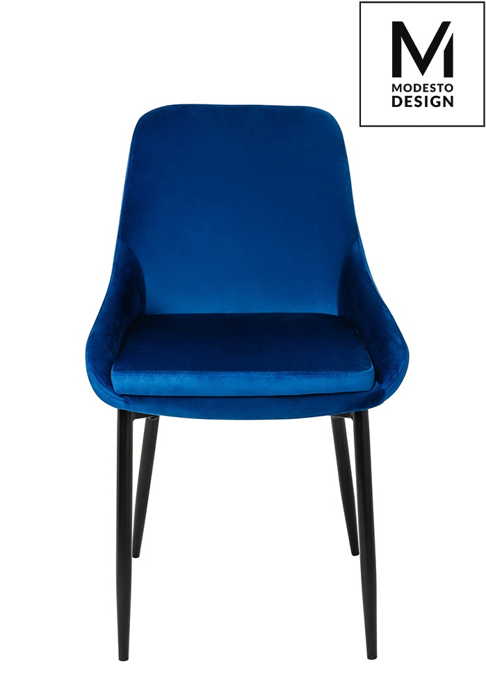 - MODESTO krzesło CLOVER ciemny niebieski - welur, metal. Połączenie wyjątkowej wygody i stylowego designu. Stabilna konstrukcja z metalu w kolorze czarnym zapewnia trwałość i nowoczesny wygląd. Całość tapicerowana jest przyjemnym w dotyku welurem, który na