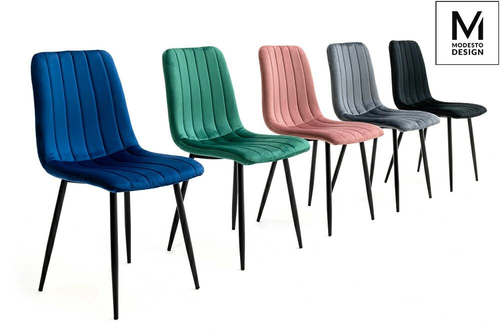 - MODESTO krzesło LARA zielone - welur, metal. Styl i funkcjonalność w idealnej harmonii. Podstawa z metalu lakierowanego na kolor czarny zapewnia stabilność i trwałość konstrukcji. Pokryte jest miękką, welurową tapicerką, która zachwyca subtelnym połyskiem