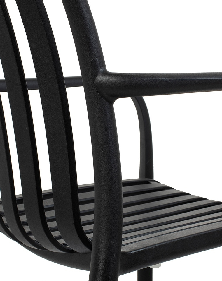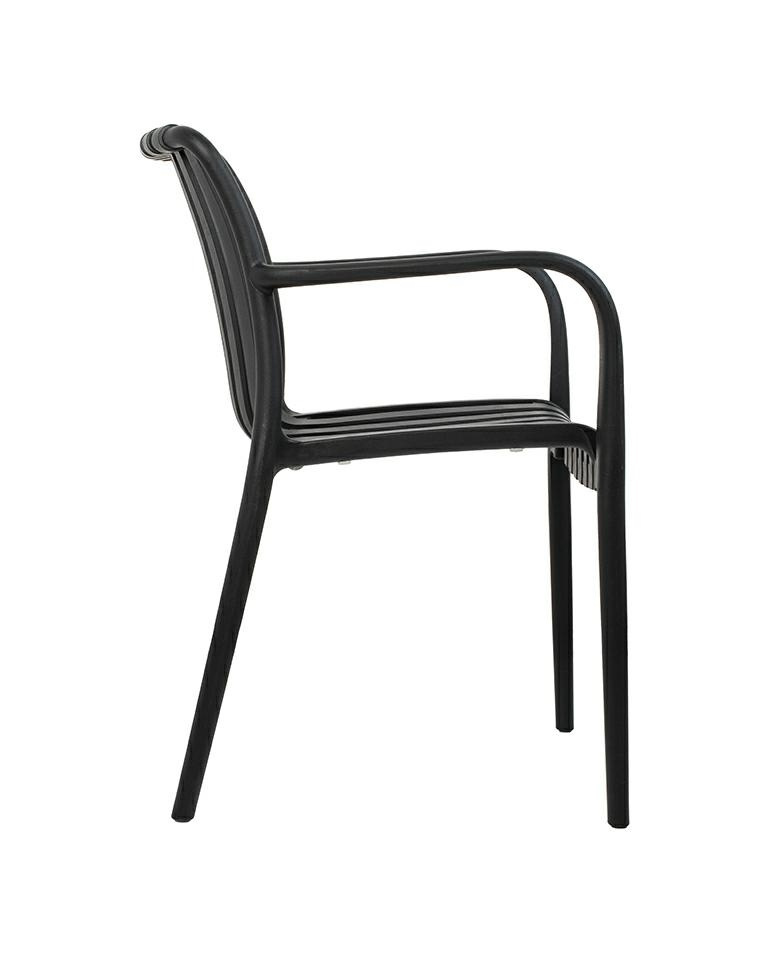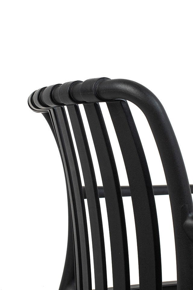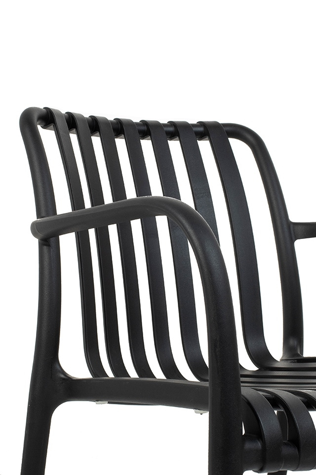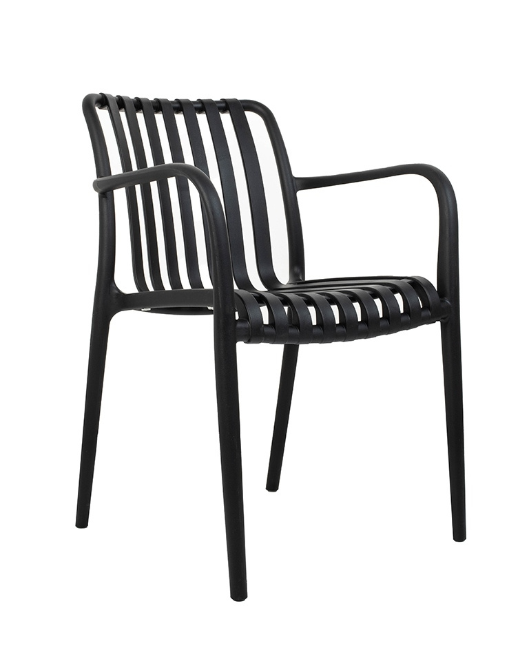 MODESTO krzesło Strips czarne - polipropylen. Nowoczesny, minimalistyczny styl, który sprawdzi się w wielu wnętrzach. Ciekawy, a zarazem prosty kształt wykonano z polipropylenu i wykończono w klasycznej czerni. Krzesło Strips to produkt wpisujący się w najnowsze trendy wnętrzarskie. Dużym atutem jest, że może być stosowane zarówno do użytku zewnętrznego i wewnętrznego. Dostępna także zielona oraz beżowa wersja. Wymiary: wys. 80 cm / szer. 56 cm / gł. 60 cm Wysokość do krawędzi siedziska: 46 cm Siedzisko: szer. 41 cm / gł. 42 cm Oparcie: wys. 45 cm / szer. 42 cm Wysokość do podłokietników: 67 cm Rozstaw nóg: szer. 51cm / gł. 49 cm.Cechy produktu