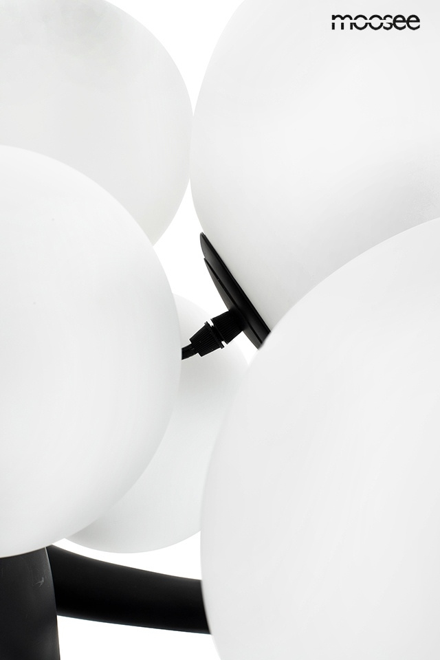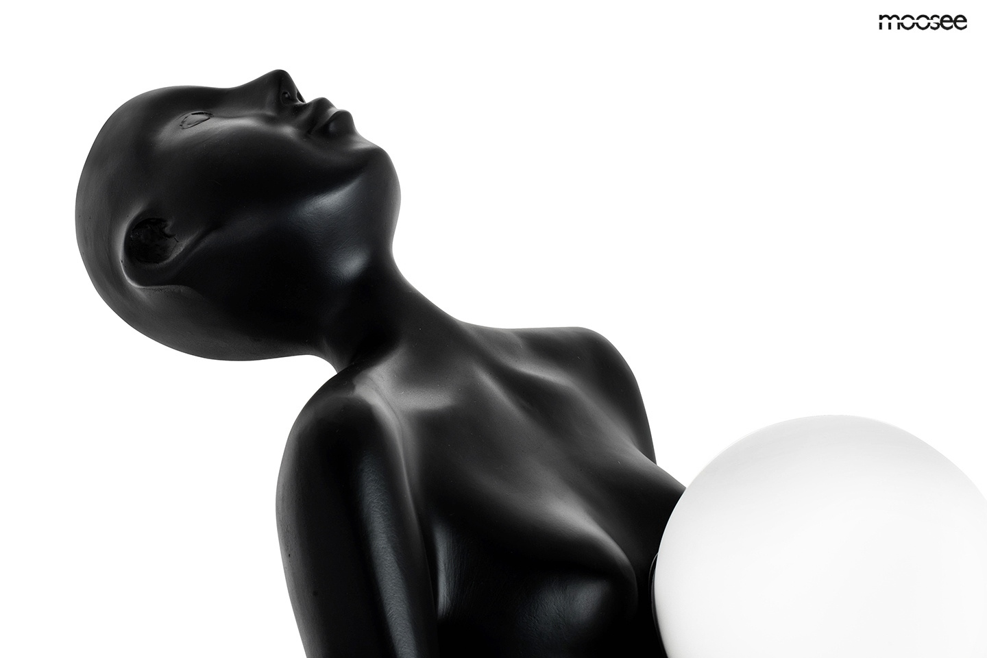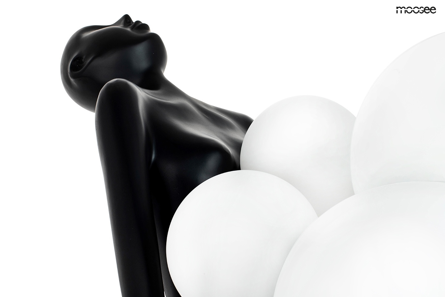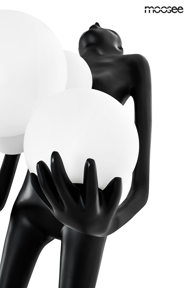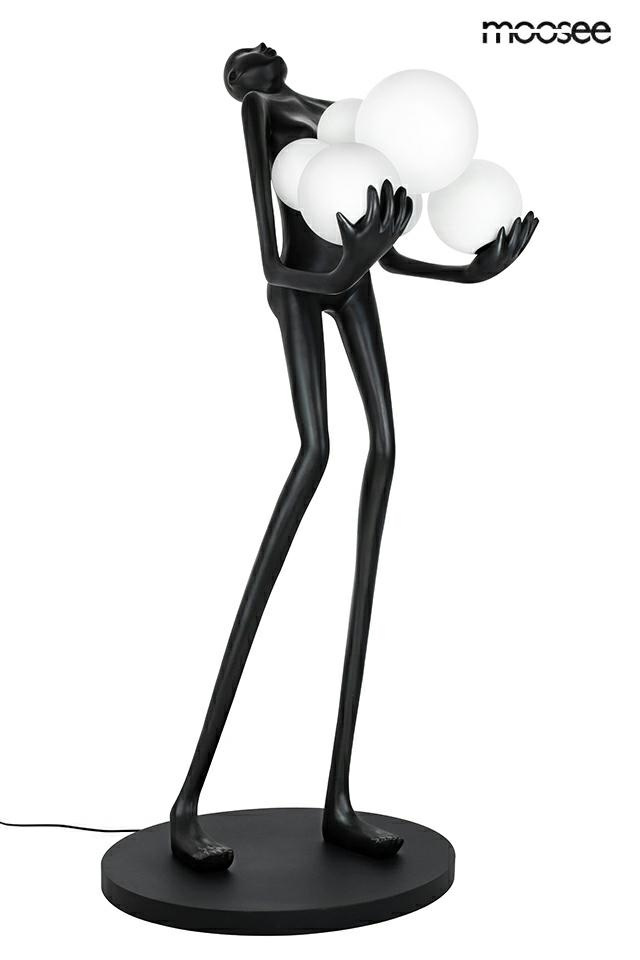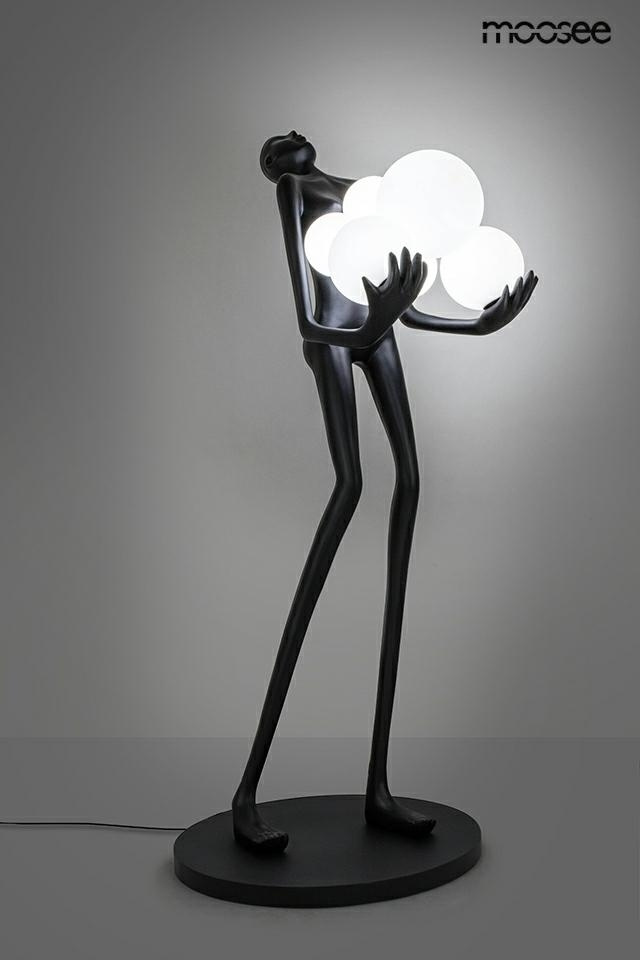 - MOOSEE lampa podłogowa HUMAN czarna. Wykonana z włókna szklanego w kolorze czarnym i sześciu białych, szklanych kloszy w różnych rozmiarach. Stworzony kontrast kolorystyczny idealnie współgra z oryginalnym kształtem oprawy. Sylwetka człowieka utrzymująca