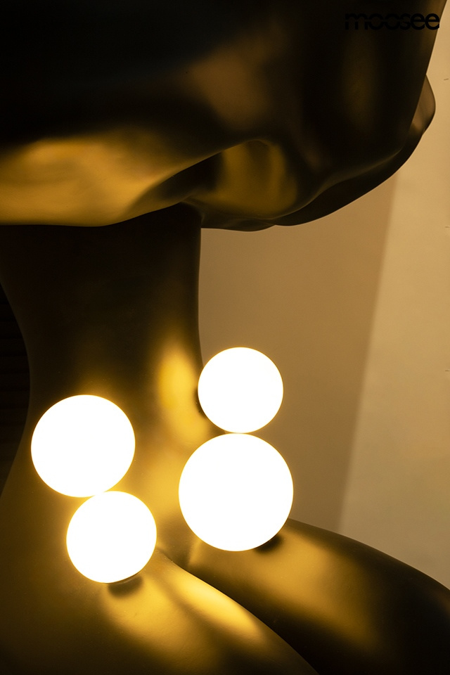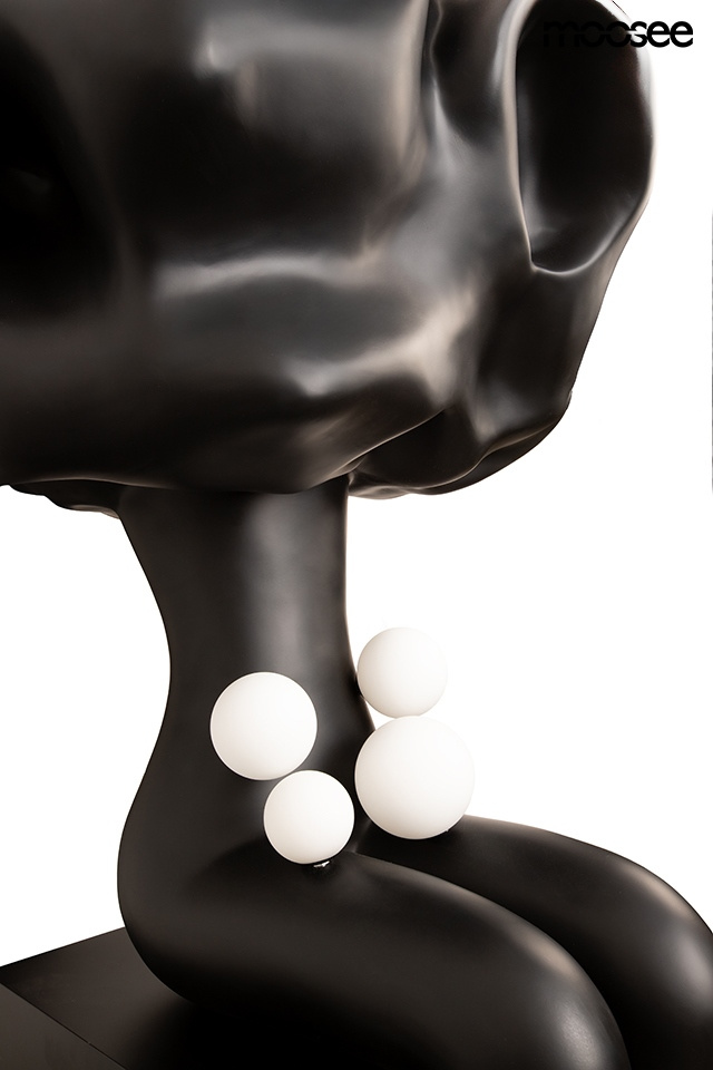 MOOSEE lampa podłogowa HUMAN IN THE CLOUDS czarna. Prawdziwe dzieło sztuki użytkowej, które balansuje na granicy designu i rzeźby. Niezwykle ekspresyjna forma - postać o surrealistycznej głowie z "chmurą myśli" intryguje i przyciąga wzrok, stając się centralnym punktem każdej przestrzeni. Wykonana z matowego, czarnego włókna szklanego, spoczywa na minimalistycznej stalowej podstawie, która podkreśla rzeźbiarską sylwetkę. Subtelne, mleczne klosze z matowego szkła miękko rozpraszają światło, tworząc intymną i nastrojową atmosferę. To lampa, która nie tylko rozświetla wnętrze, ale też opowiada historię i skłania do refleksji. Idealna dla odważnych estetów, którzy szukają czegoś więcej niż tylko funkcjonalnego oświetlenia. Światło: 4 x G9 max. 3 W (brak w zestawie) Oprawa: wys. 205 cm Klosze: śr. 2 x 8 cm / 2 x 12 cm Podstawa: wys. 70.5 cm / szer. 45 cm / gł. 45 cm Waga netto: 72 kg Wymiary opakowania: 121,5 cm / 121,5 cm / 97,5 cm 75 cm / 75 cm / 51 cm.Cechy produktu