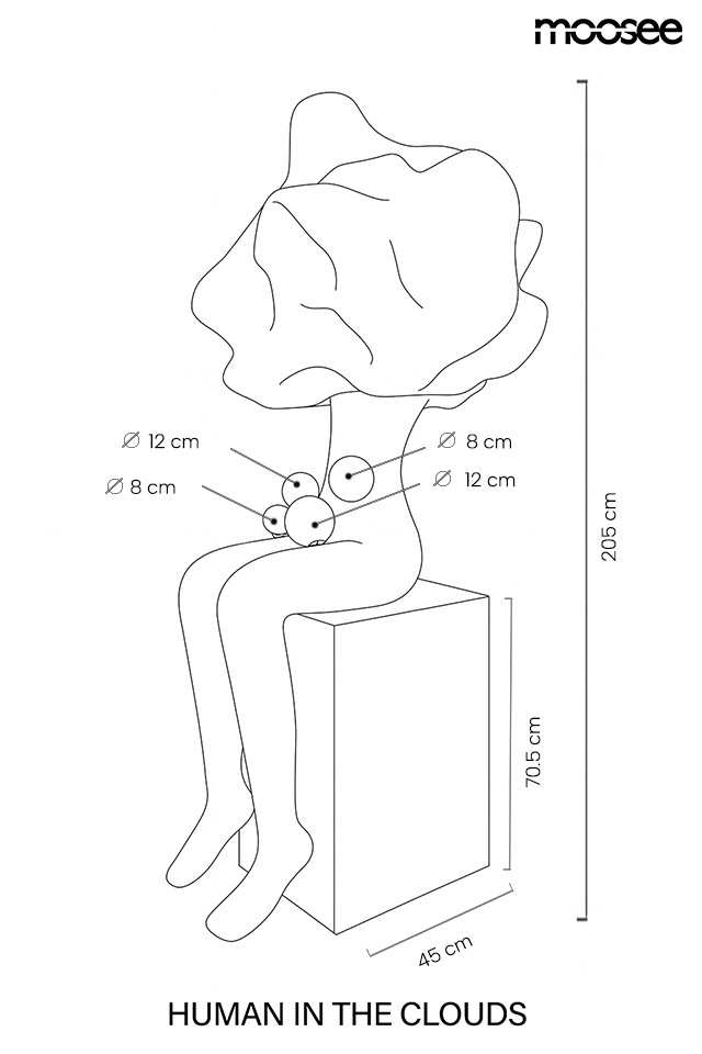 - MOOSEE lampa podłogowa HUMAN IN THE CLOUDS czarna. Prawdziwe dzieło sztuki użytkowej, które balansuje na granicy designu i rzeźby. Niezwykle ekspresyjna forma - postać o surrealistycznej głowie z "chmurą myśli" intryguje i przyciąga wzrok, stając się cent