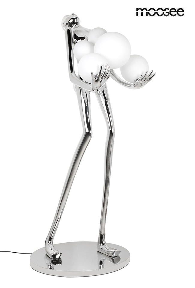 MOOSEE lampa podłogowa HUMAN SILVER PREMIUM. Harmonijne połączenie sztuki i funkcjonalności – unikatowa rzeźba, która jednocześnie pełni rolę designerskiego oświetlenia. Wykonana z włókna szklanego, zachwyca lustrzanym chromowanym wykończeniem, dodając przestrzeni nowoczesnego blasku. Figura trzymająca mleczne, szklane kule tworzy subtelny efekt rozproszonego światła, idealny do stworzenia wyrafinowanej atmosfery. To propozycja dla wymagających – doskonale prezentuje się w nowoczesnych wnętrzach, ekskluzywnych butikach, galeriach czy hotelach. Human Silver Premium łączy w sobie minimalistyczną elegancję, luksus i odważny design, stanowiąc wspaniałą dekorację dla miłośników oryginalnych produktów. Światło: 6 x E27 max. 30 W (brak w zestawie) Oprawa: wys. 180 cm / szer. 80 cm / gł. 70 cm Klosz: śr. 1 x 25 cm / śr. 2 x 18 cm / śr. 3 x 14 cm Podstawa: szer. 80 cm / gł. 60 cm Waga netto: 30 kg Wymiar opakowania: 200 cm / 78 cm / 78 cm Sposób wysyłki: paleta.