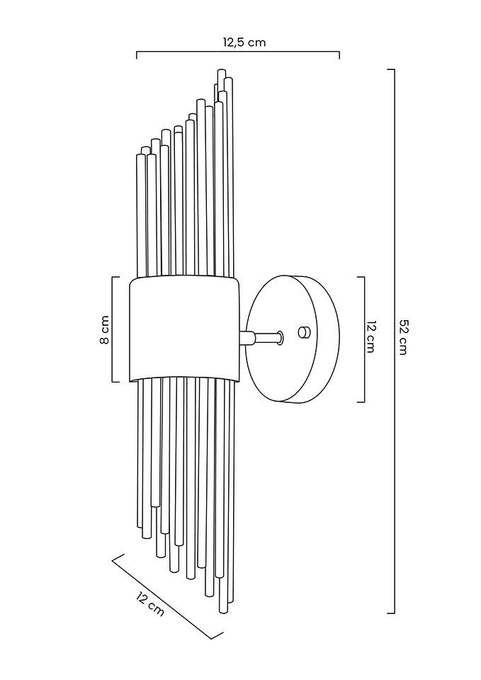 MOOSEE lampa ścienna AMADEO złota. Niezwykle nowoczesny i elegancki kinkiet w stylu glamour. Kryształowe klosze o różnych długościach, przeplatają się z dekoracyjnymi elementami w kolorze złotym, optycznie wydłużając kinkiet. Całość zamontowana na metalowym stelażu w kolorze złotym, a snop światła skierowany jest zarówno w górę, jak i w dół. Światło: 2 x G9 max 25 W (brak w zestawie) Oprawa: wys. 52 cm / szer. 12 cm / gł. 12,5 cm Mocowanie: śr. 12 cm / gł. 2,5 cm Element ozdobny: wys. 8 cm Montaż: instalacja ścienna Waga netto: 2 kg Wymiary opakowania: 55 cm / 25 cm / 15 cm.Cechy produktu