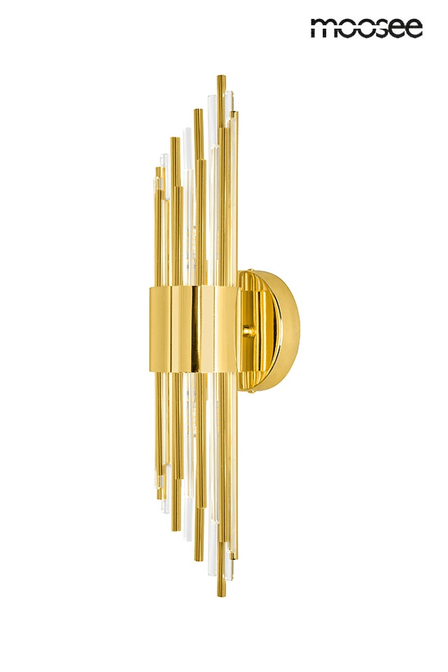 - MOOSEE lampa ścienna AMADEO złota. Niezwykle nowoczesny i elegancki kinkiet w stylu glamour. Kryształowe klosze o różnych długościach, przeplatają się z dekoracyjnymi elementami w kolorze złotym, optycznie wydłużając kinkiet. Całość zamontowana na metalow