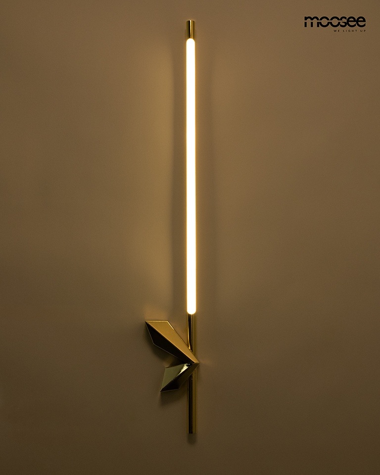 MOOSEE lampa ścienna ESPADA złota. Wyjątkowy akcent dekoracyjny, który łączy nowoczesność z wyrazistym designem. Smukła i nietuzinkowa forma przyciąga wzrok, to propozycja dla osób ceniących odważne wzornictwo i wysoką jakość wykonania. Całość wykończona jest w eleganckim, złotym kolorze, który wprowadza luksusowy charakter do wnętrza. Wbudowane źródło światła LED emituje przyjemne, ciepłe światło, idealne do sypialni, salonu czy przedpokoju. Światło: LED 6 W / 480 lm / 3000 K Oprawa: wys. 87 cm / szer. 11 cm / gł. 4 cm Montaż: instalacja ścienna Waga netto: 0,7 kg Wymiary opakowania: 90 cm / 15 cm / 15 cm.Cechy produktu