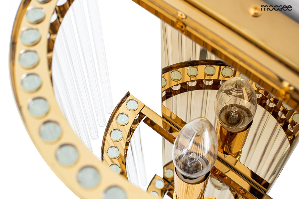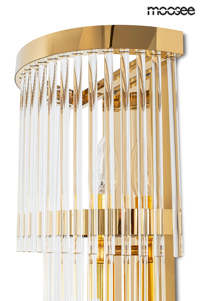 - MOOSEE lampa ścienna ESTRO złota. Nowoczesna oprawa w stylu glamour została wykonana z połączenia szkła oraz stali nierdzewnej w złotym kolorze. Oświetlenie w wyjątkowy sposób przebija się przez kaskadowo zawieszone transparentne klosze. Dzięki zastosowan