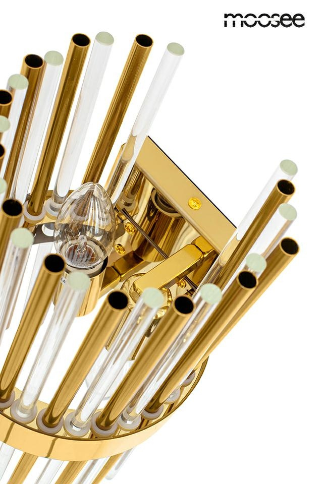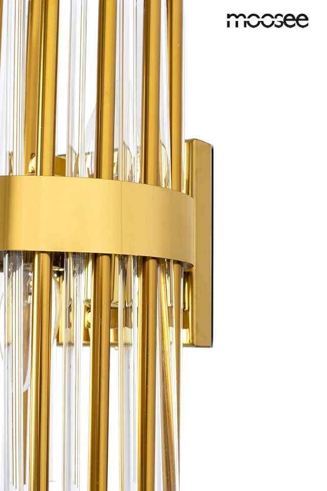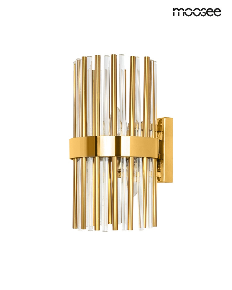 - MOOSEE lampa ścienna GARDA. Nowoczesna oprawa ścienna o ponadczasowej formie. Wykonana została ze stali w kolorze złotym. Całości dopełniają piękne kryształowe klosze, które odbijają światło, tworząc niesamowity efekt wizualny na ścianie. Będzie doskonały