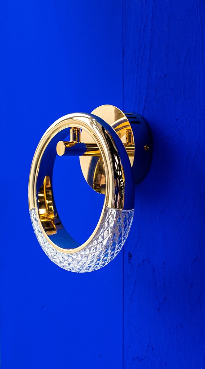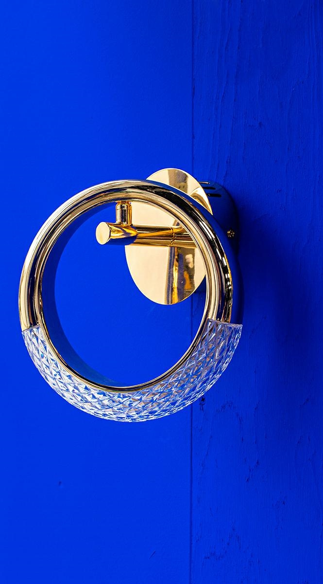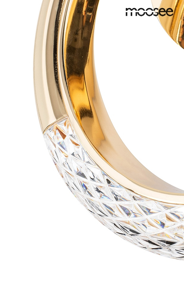 • MOOSEE lampa ścienna HELIOS złota. Przypominająca elegancką kołatkę oprawa została wykonana z aluminium w złotym kolorze i dekoracyjnych kryształów. Błyszczący akcent klosza rozprasza padający strumień światła, nadając prostej, a zarazem designerskiej for