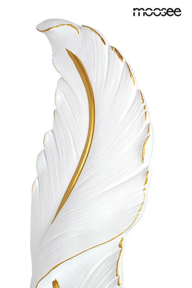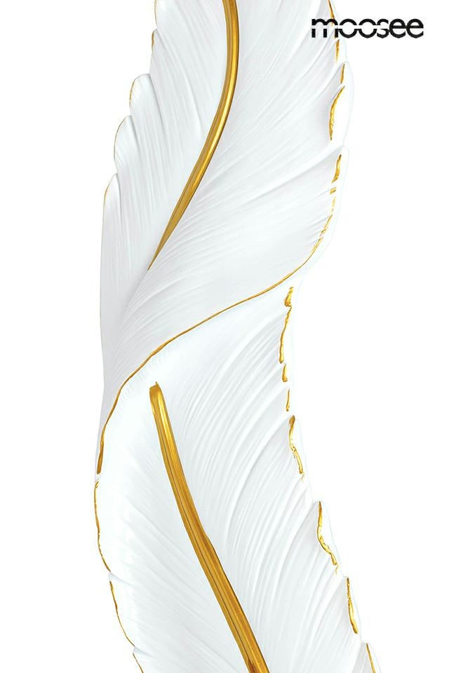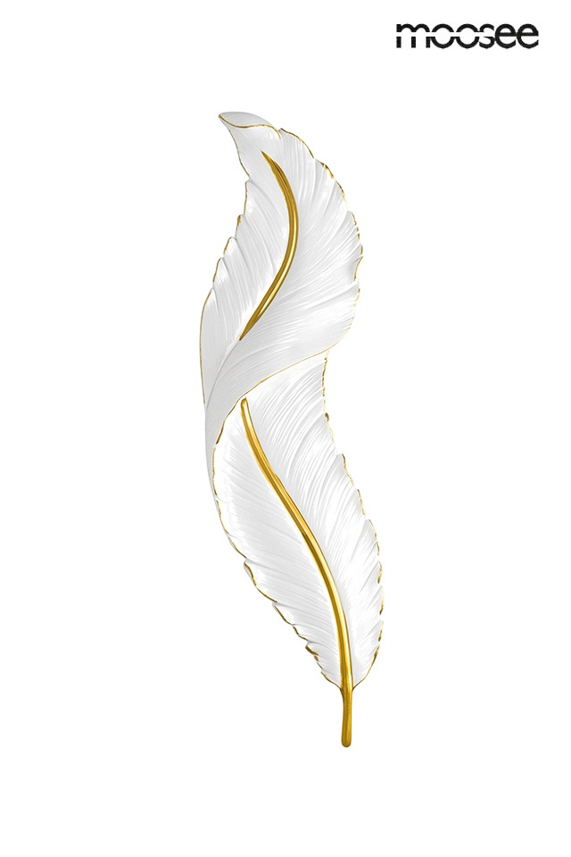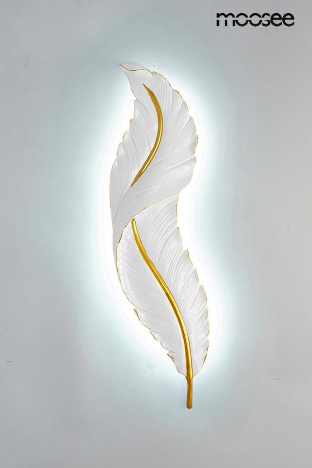 - MOOSEE lampa ścienna IKAR 60. Ten niezwykle efektowny kinkiet został zainspirowany opadającym lekkim piórem. Całość ręcznie stworzono z żywicy, dzięki czemu lampa Ikar wygląda bardzo realistycznie. Biało-złote wykończenie dodaje elegancji i klasy. Zarówno