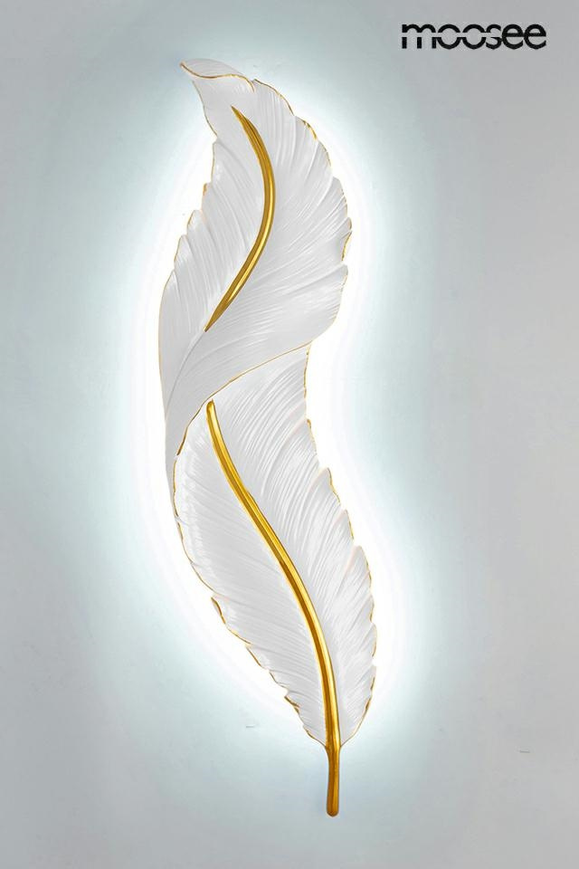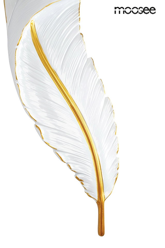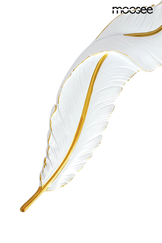 - MOOSEE lampa ścienna IKAR 80. Ten niezwykle efektowny kinkiet został zainspirowany opadającym lekkim piórem. Całość ręcznie stworzono z żywicy, dzięki czemu lampa Ikar wygląda bardzo realistycznie. Biało-złote wykończenie dodaje elegancji i klasy. Zarówno