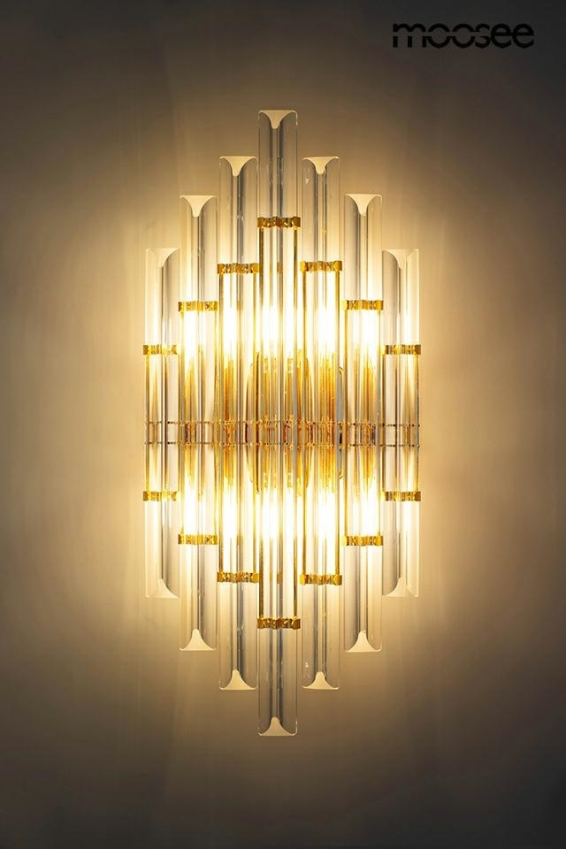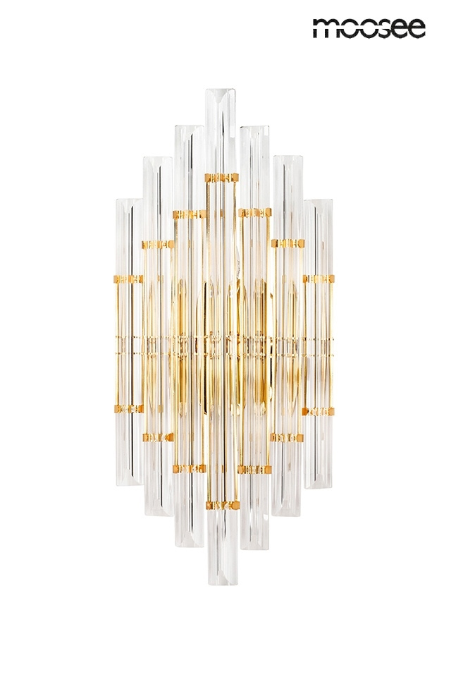 - MOOSEE lampa ścienna PALAZZO złota. Wyjątkowe połączenie metalu i transparentnego, kryształowego szkła w pałacowym stylu. Przebijające przez klosz złocenie nadaje oprawie elegancji, a wymienne źródło światła pozwoli dostosować barwę oraz moc oświetlenia d