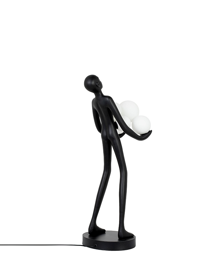 - MOOSEE lampa stołowa HUMAN PREMIUM czarna. Oryginalna propozycja dla miłośników designu, łącząca funkcję oświetleniową z artystyczną formą. Wykonana z czarnego włókna szklanego, przedstawia postać ludzką, która trzyma w dłoniach szklane klosze. To nie tyl