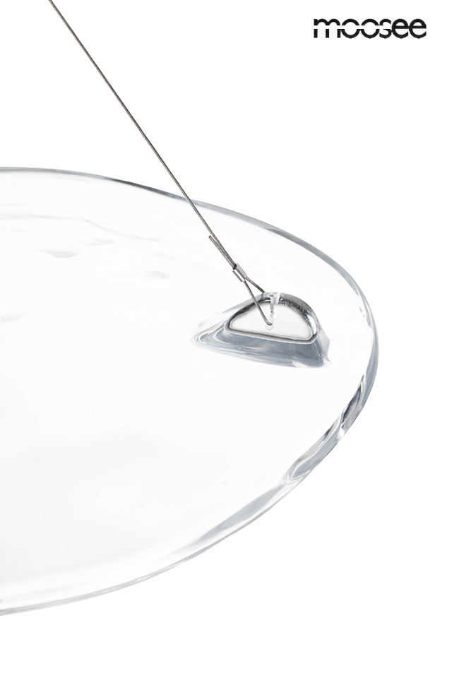 - MOOSEE lampa wisząca AQUA 25. Nowoczesna, przezroczysta oprawa, która ozdobi nie jedno wnętrze swoim oryginalnym designem. Piękny, szklany klosz doskonale rozprasza światło. Nieregularny kształt dodaje ciekawego charakteru oraz sprawia, że każdy egzemplar