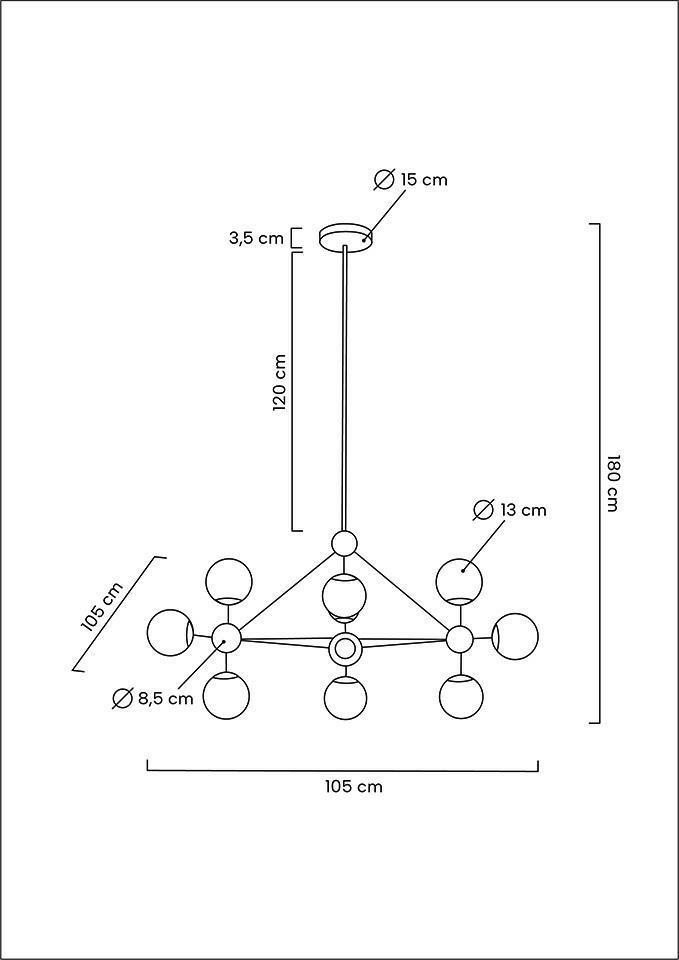 MOOSEE lampa wisząca ASTRIFERO 10. Konstrukcja lampy wykonana została z metalu w kolorze złotym. Całość dopełnia 10 okrągłych, szklanych kloszy o bursztynowym kolorze. Do regulacji wysokości oprawy służą 3 metalowe, wkręcane pręty o długościach 2 x 50 cm oraz 1 x 20 cm. Na kloszu mogą wystąpić pęcherzyki powietrza, które są naturalnym efektem ręcznej obróbki szkła. Światło: 10 x E27 max 40 W (brak w zestawie) Oprawa: wys. 180 cm / szer. 105 cm / gł. 105 cm Klosza: śr. 13 cm Mocowanie: śr. 15 cm / wys.3,5 cm Montaż: instalacja sufitowa Waga netto: 6 kg Wymiary opakowania: 79 cm / 35 cm / 29 cm. *W kloszach mogą wystąpić pęcherzyki powietrza, które są naturalnym efektem powstałym podczas ręcznej obróbki szkła.