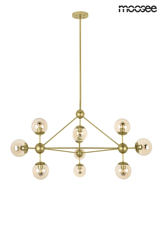 • MOOSEE lampa wisząca ASTRIFERO 10. Konstrukcja lampy wykonana została z metalu w kolorze złotym. Całość dopełnia 10 okrągłych, szklanych kloszy o bursztynowym kolorze. Do regulacji wysokości oprawy służą 3 metalowe, wkręcane pręty o długościach 2 x 50 cm