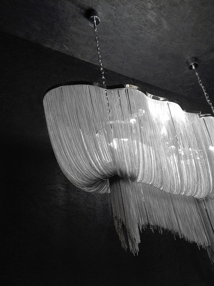 • Atlanta Long to niezwykła lampa wisząca, inspirowana projektem Terzani Atlantis posiada nieregularne kształty, niczym fale oceanu. Została wykonana z aluminium i stalowych, drobnych łańcuchów, dzięki którym światło jest przyjemnie rozproszone, a sama lamp