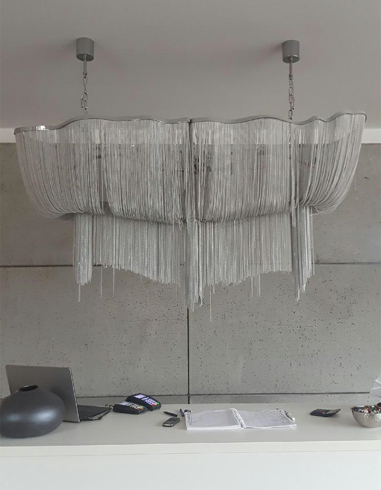 Atlanta Long to niezwykła lampa wisząca, inspirowana projektem Terzani Atlantis posiada nieregularne kształty, niczym fale oceanu. Została wykonana z aluminium i stalowych, drobnych łańcuchów, dzięki którym światło jest przyjemnie rozproszone, a sama lampa wygląda ekskluzywnie i elegancko. W środku lampy znajduje się aż 10 mocowań na żarówki, co daje całkiem intensywne i równomierne oświetlenie. Lampa Atlanta pasuje zarówno do salonów, czy sypialni, jak również do wszelkich stylowych przestrzeni,takich jak butiki, salony urody, czy hotele. Oprawa: wys. 250 cm / szer. 160 cm / gł. 40 cm Montaż: instalacja sufitowa.