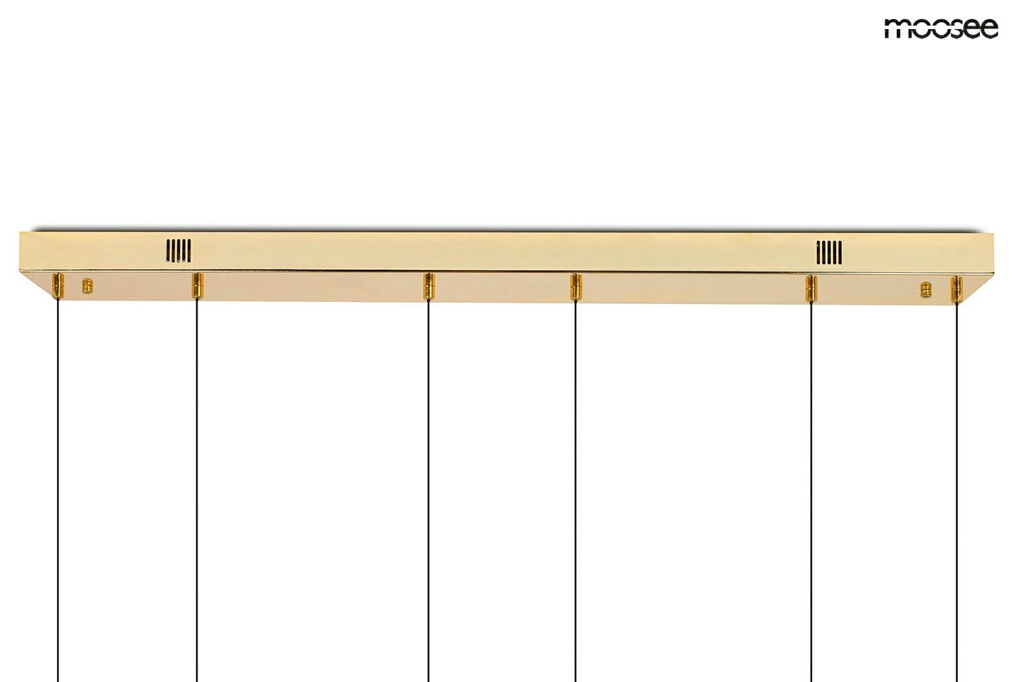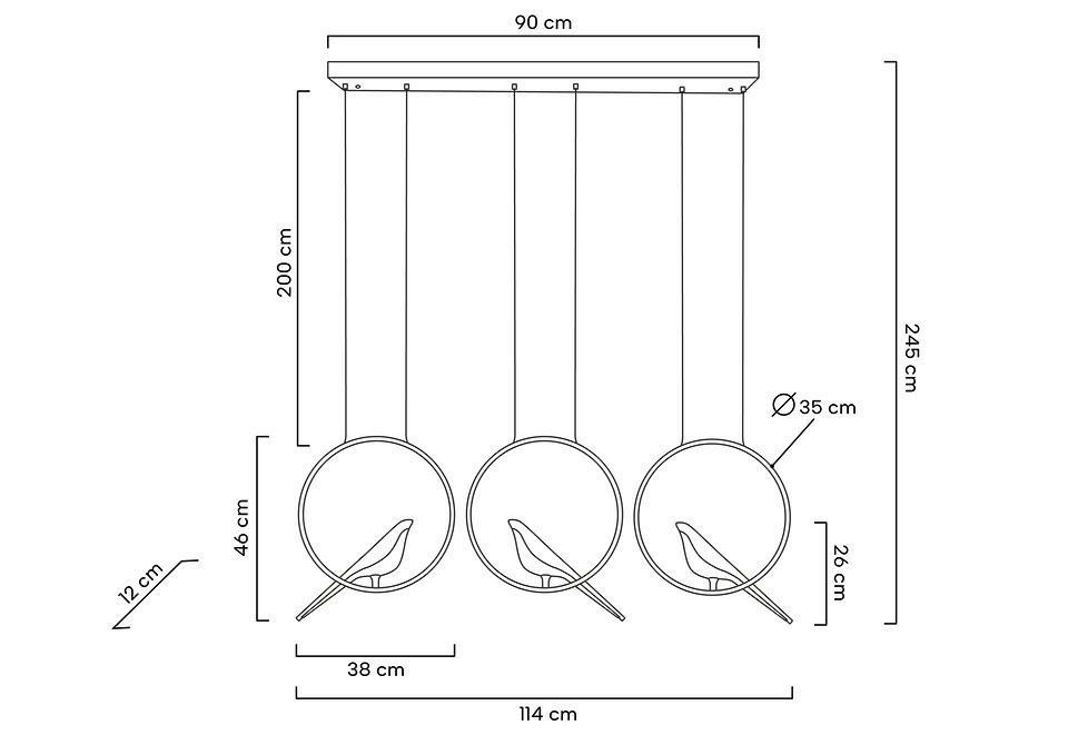MOOSEE lampa wisząca BIRD LINE złota. Designerski motyw lampy wykonany z połączenia akrylu i metalu w nowoczesnej kolorystyce. Kombinacja trzech biało-złotych ptaszków zawieszonych na złotym okręgu została zamocowana czarnym przewodem do podłużnej, metalowej podsufitki w kolorze złotym. Kolekcja Bird pozwala na stworzenie spójnych aranżacji, które pięknym akcentem udekorują każdą przestrzeń. Światło: LED 24 W / 1920 lm / 3000 K Oprawa: wys. 245 cm / szer. 90 cm / gł. 12 cm Klosz: wys. 46 cm / szer. 38 cm / gł. 12 Ptak: wys. 26 cm / szer. 12 / gł. 30 cm Okręg: śr. 35 cm Mocowanie: wys. 5 cm / szer. 90 cm / gł. 12 Kabel: 200 cm Montaż: instalacja sufitowa Waga brutto: 3 kg Wymiary opakowania: 120 cm / 63 cm / 15 cm.Cechy produktu