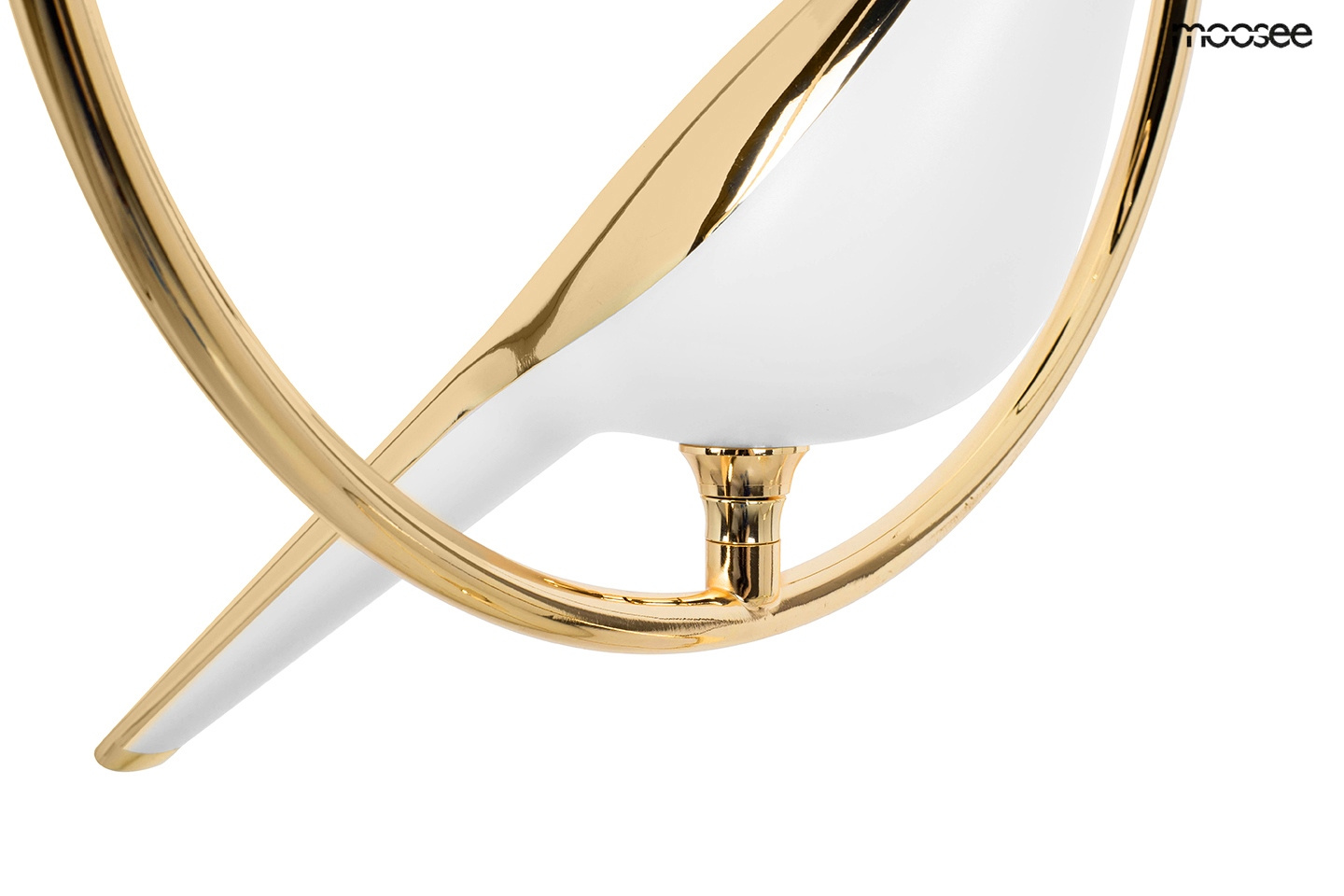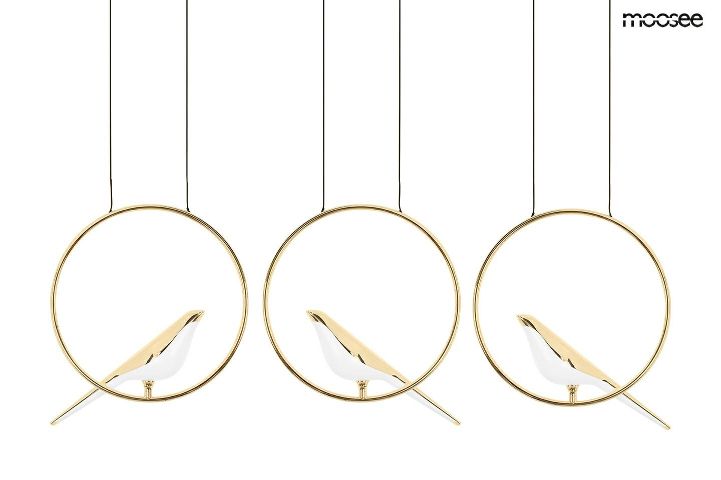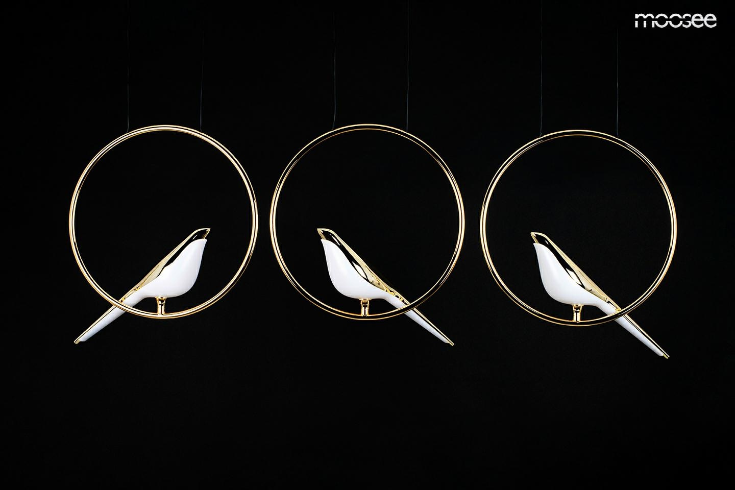 - MOOSEE lampa wisząca BIRD LINE złota. Designerski motyw lampy wykonany z połączenia akrylu i metalu w nowoczesnej kolorystyce. Kombinacja trzech biało-złotych ptaszków zawieszonych na złotym okręgu została zamocowana czarnym przewodem do podłużnej, metalo