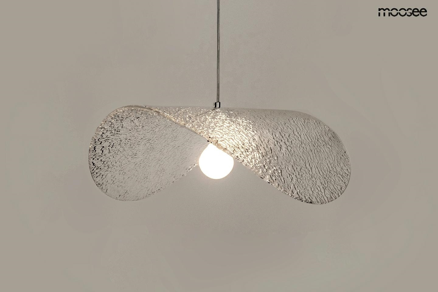 - MOOSEE Lampa wisząca CAPELLO FI 60 clear. Wyjątkowa oprawa, która zachwyca swoim pięknym, strukturalnym szklanym kloszem przypominającym kapelusz. Wewnątrz klosza ukryte jest źródło światła, które delikatnie rozprasza się przez szkło, tworząc przytulną i