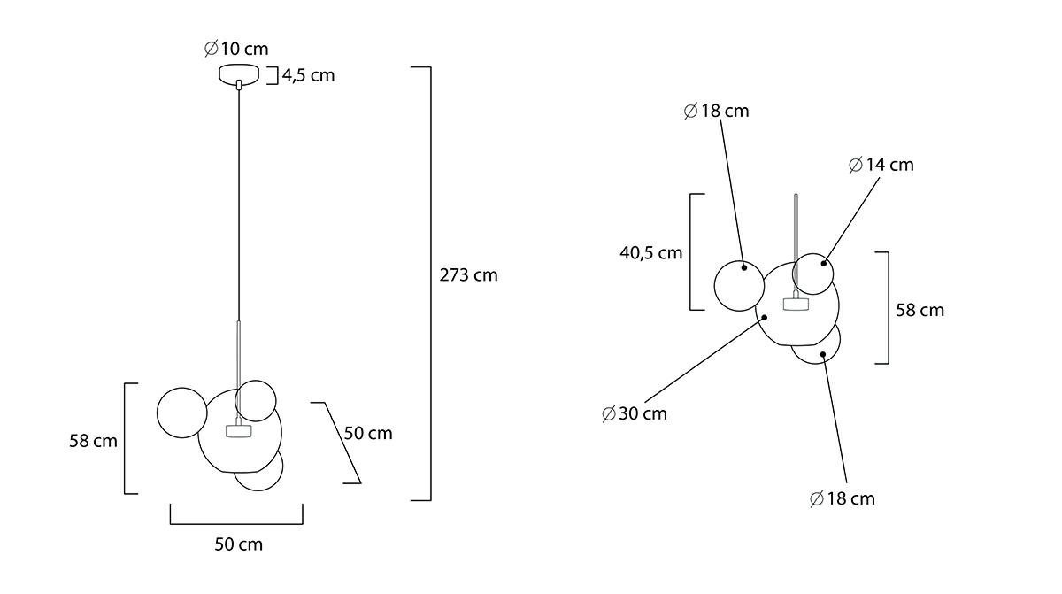 • MOOSEE lampa Capri 4 składa się z kulistych, szklanych kloszy oraz anodowanego aluminium. Główna kula zawieszona jest na delikatnym przewodzie. Wewnątrz kuli znajduje się pręt zakończony źródłem światła LED. Całość przypomina połączone bańki mydlane. Snop