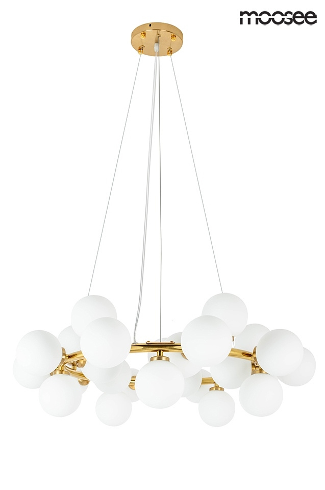 - MOOSEE lampa wisząca COSMO 72 złota. Lampa wykonana została z połączenia metalu w złotym kolorze i szklanych, kulistych kloszy. Dwadzieścia pięć kloszy wykonanych z mlecznego szkła, umieszczono na złotym ringu. Całość została zawieszona na przezroczystym
