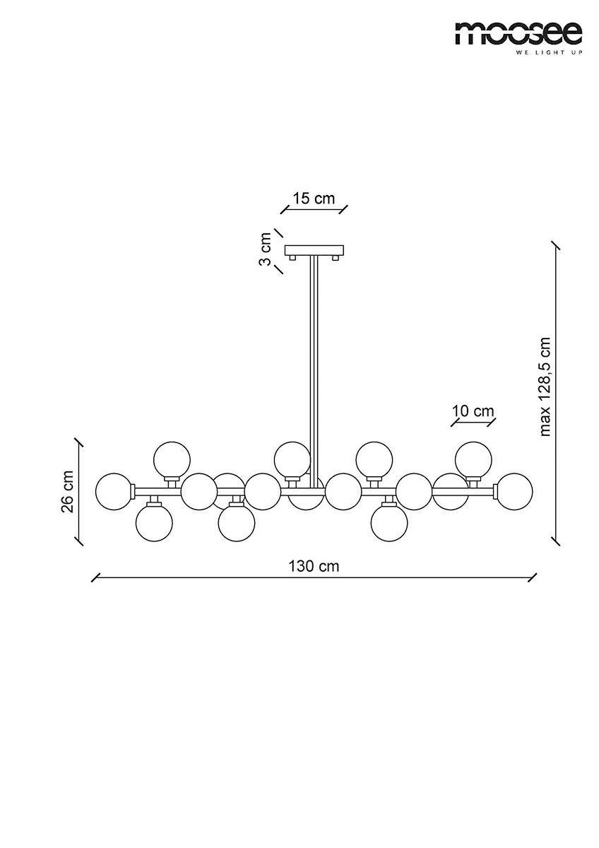 Lampa wisząca COSMO LEVEL M od marki MOOSEE. Lampy z kolekcji Cosmo wykonane zostały z połączenia metalu w czarnym, satynowym kolorze, złotych dekorów i szklanych kulistych kloszy. Szesnaście kloszy wykonanych z mlecznego szkła umieszczono na podłużnej konstrukcji. Całość została zawieszona na złotej podsufitce i złotym mocowaniu. Kolekcję Cosmo cechuje elegancja i doskonałe wykonanie. Lampa z powodzeniem rozświetli wnętrze salonu, kuchni lub hotelowego lobby. Światło: LED 16 x G4 max. 2,5 W (brak w zestawie) Oprawa: wys. 128,5 cm / szer. 130 cm / gł. 26 cm Klosz: szer. 130 cm / wys. 26 cm Klosz - kula: śr. 10 cm Mocowanie: śr. 15 cm / wys. 3 cm Montaż: instalacja sufitowa Waga netto: 6 kg Wymiary opakowania: 120 cm / 20 cm / 55 cm Sposób wysyłki : Paleta.Cechy produktu