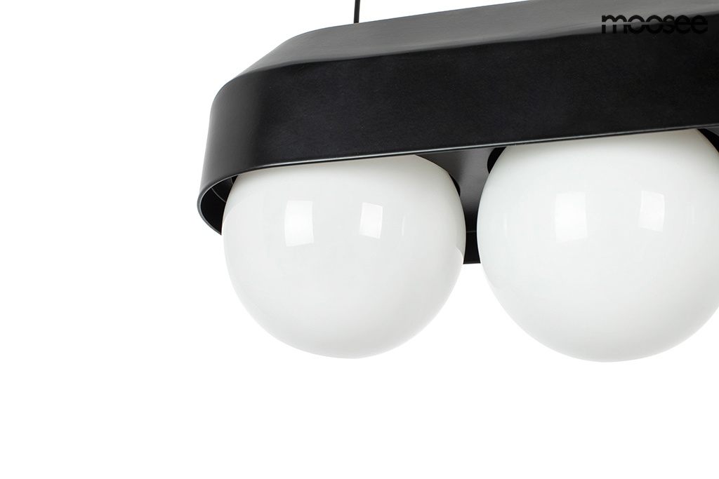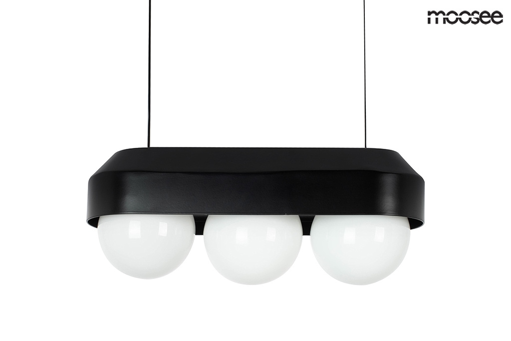 • MOOSEE lampa wisząca DROPS 3 czarna. Nowoczesna, a zarazem minimalistyczna lampa wpisująca się do każdego wnętrza. Uniwersalne połączenie kolorystyczne białych, szklanych kloszy ze stalą węglową. Kolekcja Drops pozwala na kreatywne połączenie lamp ścienny