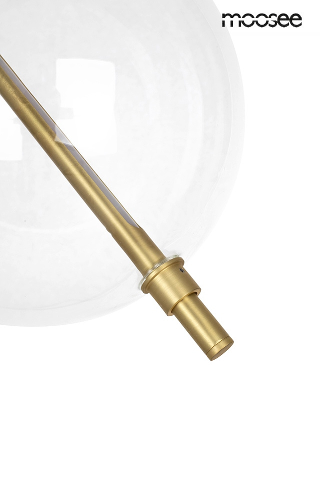 • MOOSEE lampa wisząca ECHO złota. Geometryczny kształt i nowoczesny design. Przezroczysty klosz o kształcie kuli wykonano ze szkła i oparto na metalowej konstrukcji w satynowym złotym kolorze. Echo to lampa o oryginalnym koncepcie, która z całą pewnością p