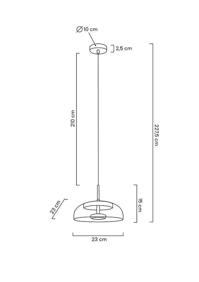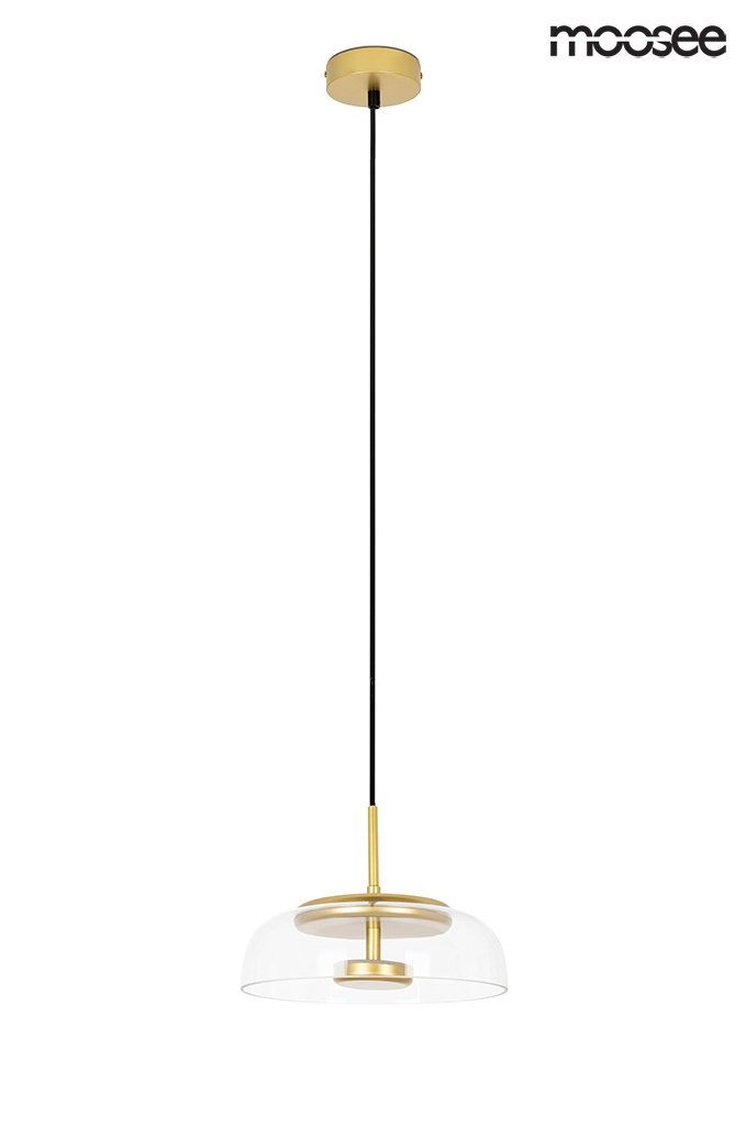 MOOSEE lampa wisząca EDEN złota. Połączenie stylowego, szklanego klosza i elementów montażowych w kolorze złotym sprawia, że oprawa świetnie sprawdzi się w nowoczesnym wnętrzu, lecz również może zostać ciekawym przełamaniem nieco bardziej surowych aranżacji. Wbudowane źródło światła skierowane jest w wewnętrzną stronę, dzięki czemu strumień świetlny odbija się od mocowania, tworząc wyjątkowy efekt. Światło: moduł LED SMD 6,5 W (wbudowany) / 520 lm / 3000 K Oprawa: wys. 227,5 cm / szer. 23 cm / gł. 23 cm Klosz: wys. 15 cm / śr. 23 cm Klosz szkło: wys. 6,5 cm Moduł LED: śr. 7 cm / wys. 2,5 cm Mocowanie: śr. 10 cm / wys. 2,5 cm Przewód: 210 cm Montaż: instalacja sufitowa Waga netto: 1 kg Wymiary opakowania: 32 cm / 32 cm / 17 cm. *W kloszu mogą wystąpić pęcherzyki powietrza, które są naturalnym efektem powstałym podczas ręcznej obróbki szkła.Cechy produktu