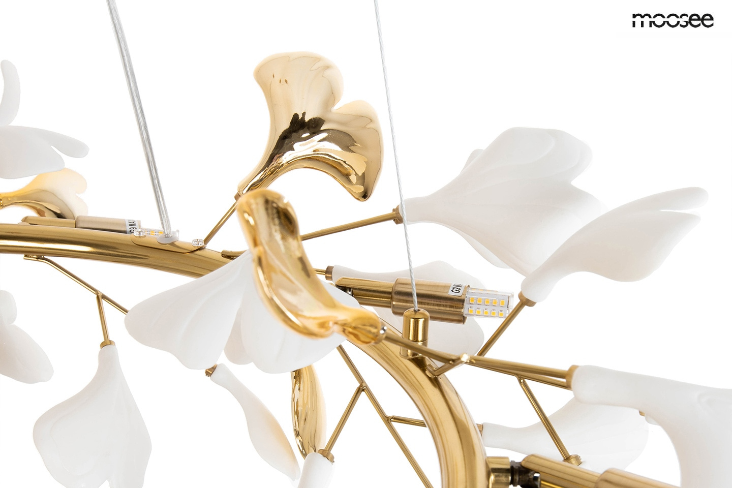 - MOOSEE lampa wisząca FLORA 120 złota. Prawdziwa poezja w formie oświetlenia, zainspirowana bujną naturą i roślinnością. Główną ozdobę pełnią tu subtelne, ceramiczne klosze przypominające płatki kwiatu. Całość umieszczono na eleganckim złotym stelażu, któr