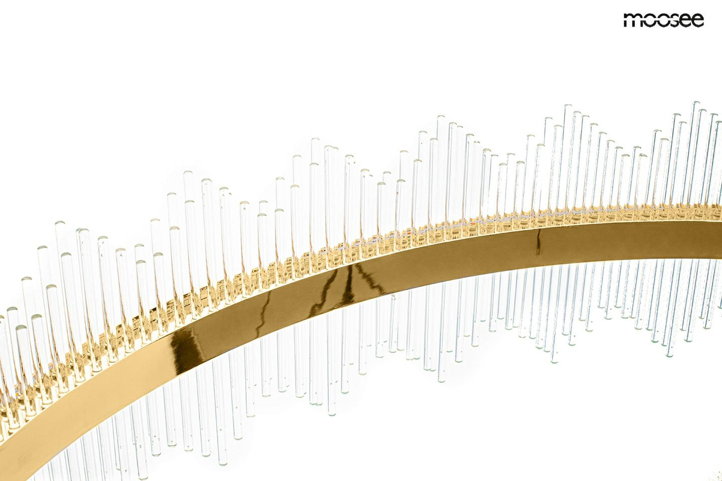 - MOOSEE lampa wisząca FLORENS 80 złota. Ekskluzywna i elegancka oprawa, która z powodzeniem ozdobi wnętrza klasyczne i nowoczesne. Szklane, transparentne klosze zamontowano w dwurzędzie na metalowej obręczy, co wyraźnie oddaje efekt kryształu. Światło skie