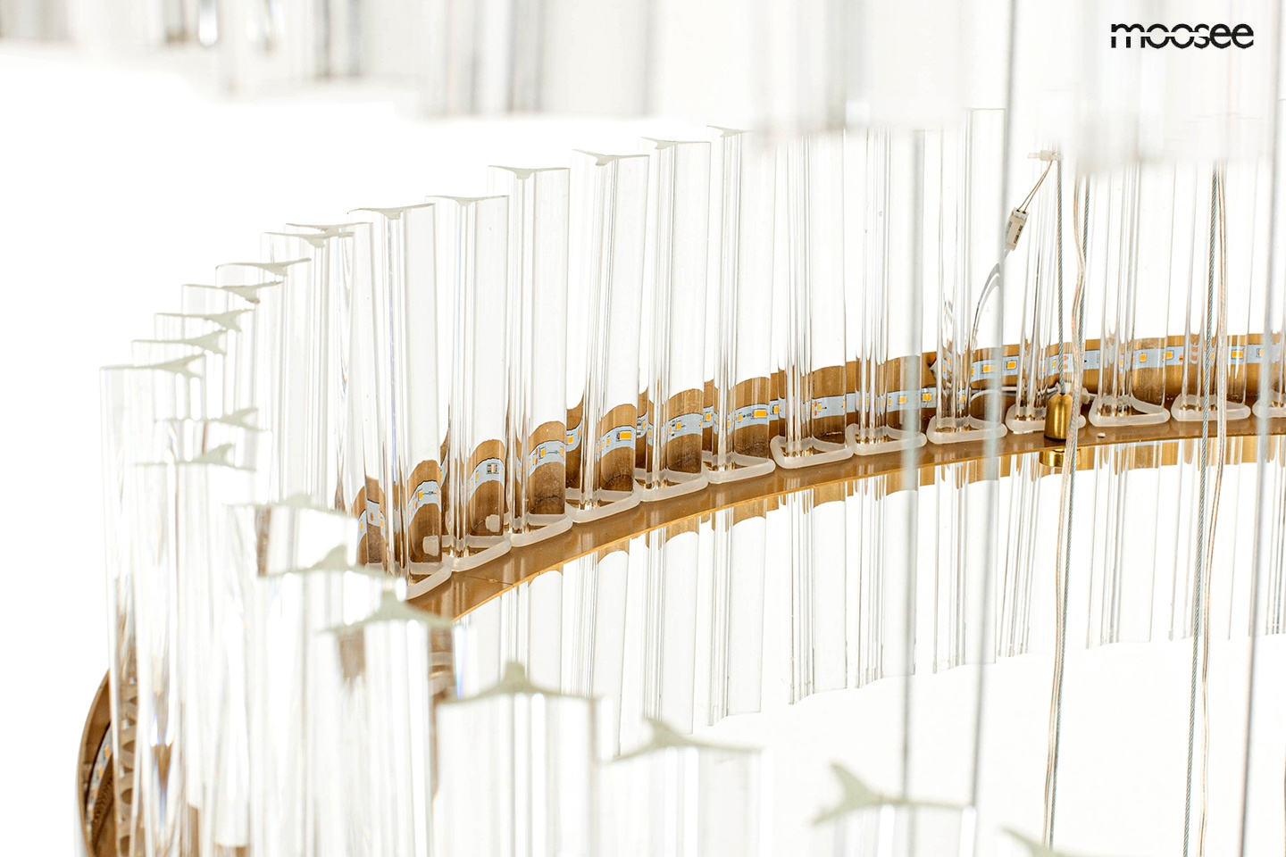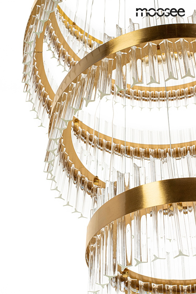 • MOOSEE lampa wisząca GHIA 5 złota. Luksusowa, imponująca oprawa o nowoczesnym, wykwintnym designie. Spektakularny efekt tworzy 5 stalowych ringów wykończonych w szykownym złotym kolorze, które wzbogacono szklanymi, przezroczystymi kloszami. Okręgi o różny