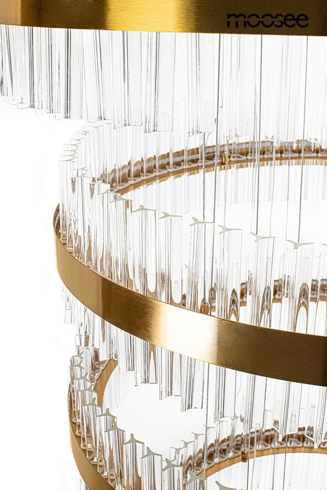MOOSEE lampa wisząca GHIA 5 złota. Luksusowa, imponująca oprawa o nowoczesnym, wykwintnym designie. Spektakularny efekt tworzy 5 stalowych ringów wykończonych w szykownym złotym kolorze, które wzbogacono szklanymi, przezroczystymi kloszami. Okręgi o różnych rozmiarach zawieszono na cienkich linkach kaskadowo. Ghia to definicja elegancji oraz wyjątkowego stylu. Polecamy do salonu czy antresoli jako główny punkt przyciągający spojrzenie. W kloszu mogą pojawić się pęcherzyki powietrza, które są naturalnym efektem powstałym podczas ręcznej obróbki szkła. Światło: LED 233 W / 18640 lm / 3000 K Oprawa: wys. 210 cm / szer. 90 cm / gł. 90 cm Klosz: wys. 20 cm / śr. 38 cm , 58 cm , 2 x 69 cm , 90 cm Mocowanie: wys. 4 cm / śr. 100 cm Przewód: 200 cm.