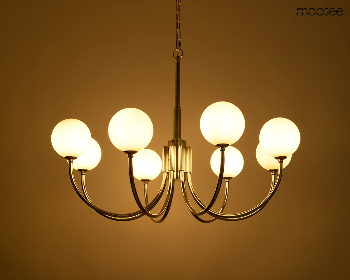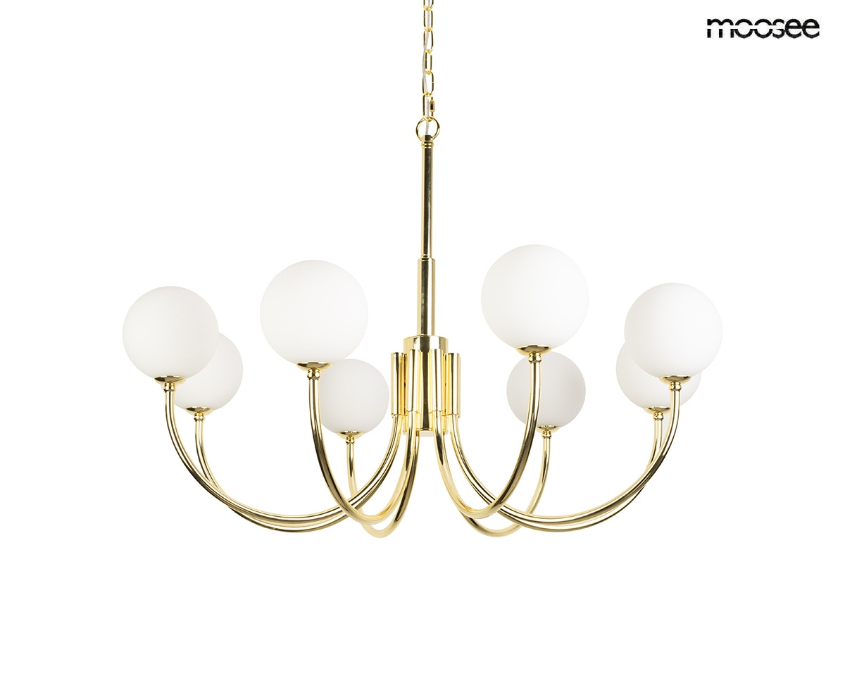 MOOSEE lampa wisząca GRACIA złota. Niepowtarzalny akcent dekoracyjny, podkreślający styl Twojej przestrzeni. Złota metalowa rama wspiera kuliste, mleczne szklane klosze, tworząc efektowną i nowoczesną formę. Doskonale uzupełnia zarówno tradycyjne, jak i współczesne aranżacje, dodając im elegancji i ciepłego blasku. Sprawdzi się w mieszkaniach oraz w luksusowych przestrzeniach gastronomicznych i hotelowych. Jeśli zależy Ci na funkcjonalnym świetle i niepowtarzalnym designie, ta lampa spełni oba te oczekiwania. Światło: 8 x LED 17 (brak w zestawie) / 1360 lm / 3000 K Oprawa: wys. 50 cm / szer. 72 cm / gł. 72 cm Kula: sr. 13 cm Mocowanie: wys. 4 cm / śr. 11 cm Przewód: 320 cm Montaż: instalacja sufitowa Waga netto: 4,5 kg Wymiary opakowania: 72 cm / 42 cm / 34 cm.