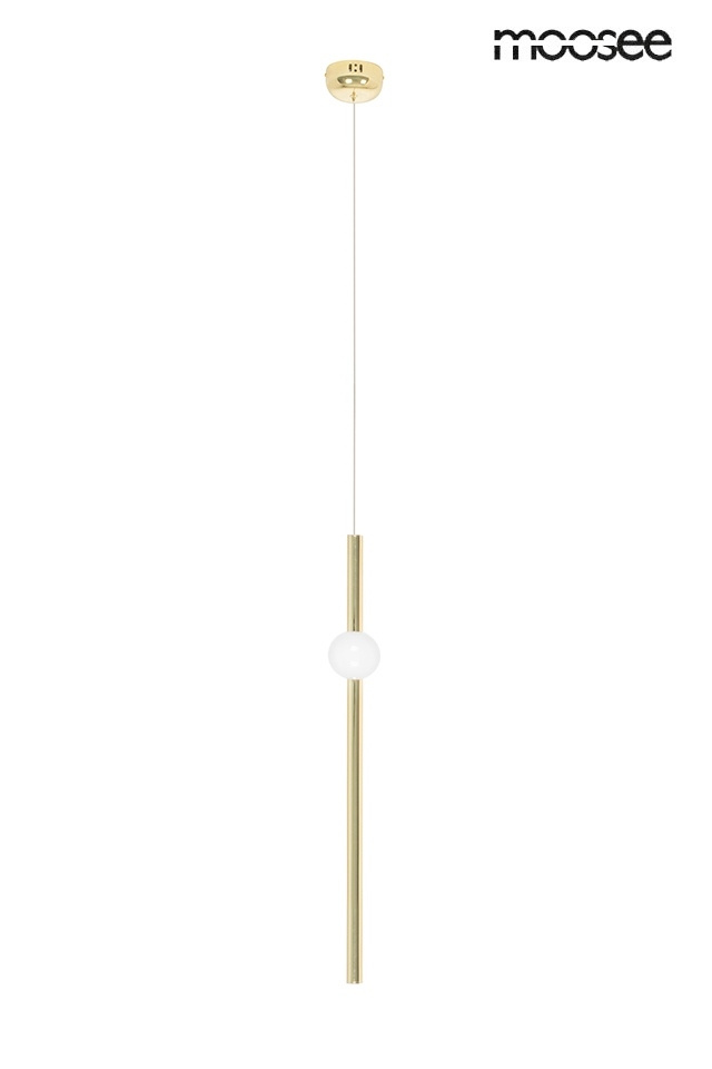 • MOOSEE lampa wisząca LIBRA 60 ON złota. Została wykonana z połączenia stali nierdzewnej w stonowanym złotym kolorze i szklanej błyszczącej kuli. Biały klosz o średnicy 10 cm umieszczono na podłużnej konstrukcji zawieszonej na lince i transparentnym przewo