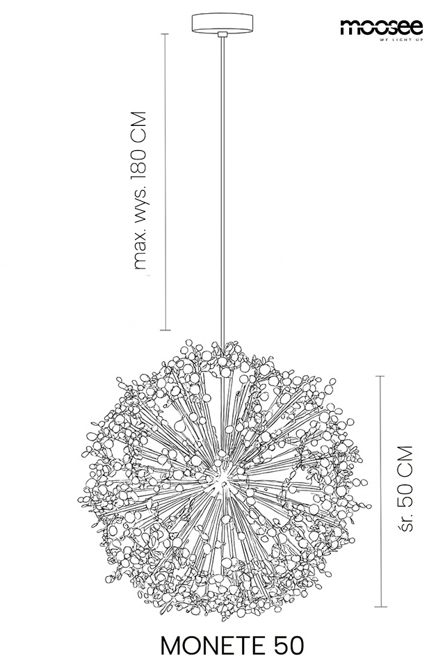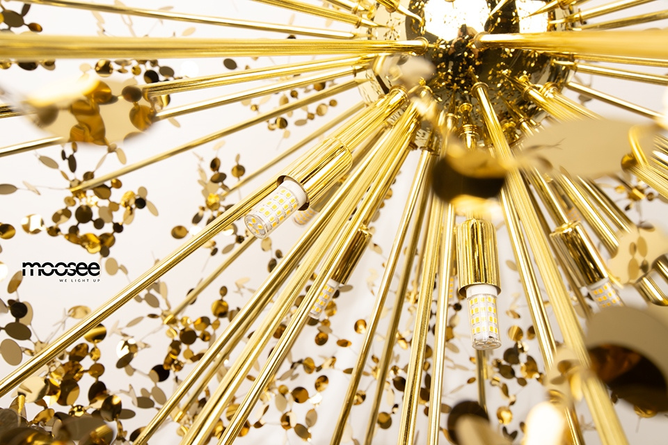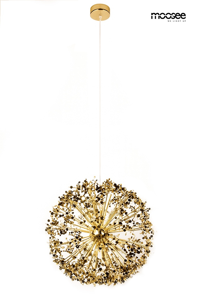 - MOOSEE lampa wisząca MONETE 50 złota. Kolekcja, która przyciąga wzrok swoją wyjątkową, dekoracyjną formą. Konstrukcja przypomina eksplozję światła lub rozwinięty kwiat dmuchawca, co dodaje wnętrzu nuty nowoczesnej elegancji. Liczne błyszczące elementy odb