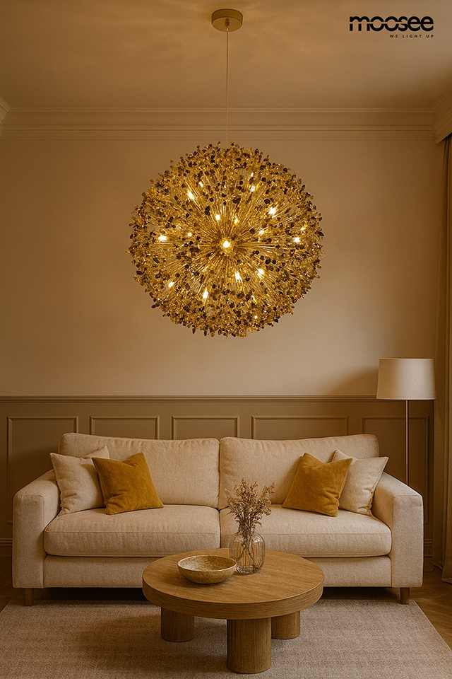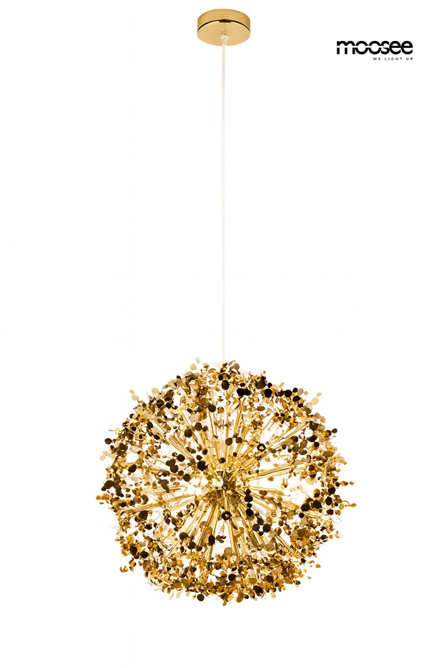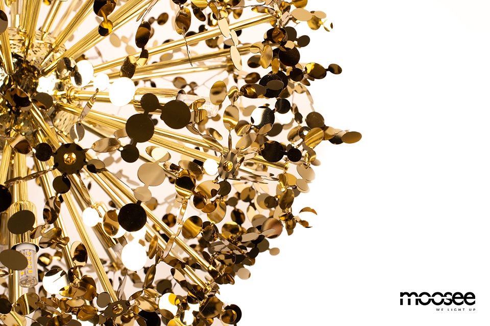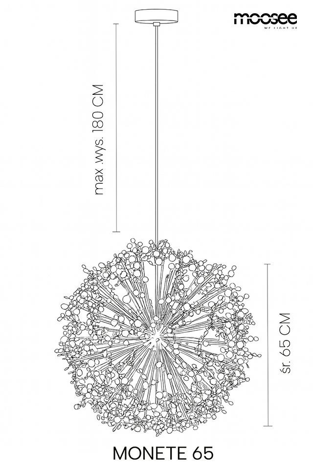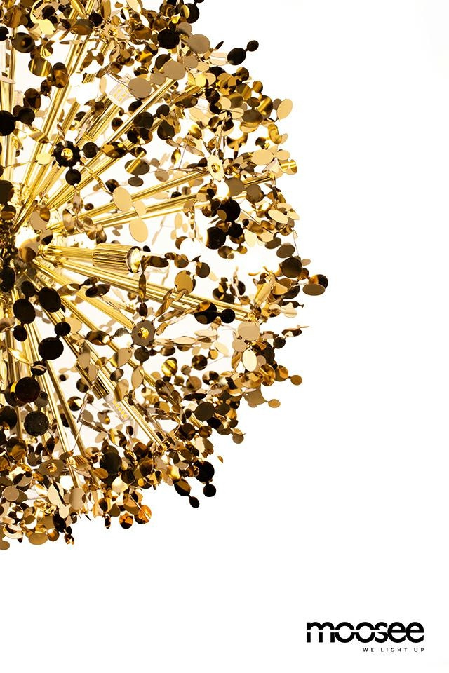- MOOSEE lampa wisząca MONETE 65 złota. Prawdziwa biżuteria w świecie oświetlenia. Rozbudowana, trójwymiarowa forma przywodzi na myśl eksplozję światła zamkniętą w artystycznym kształcie. Setki lśniących, złotych elementów tworzą spektakularny efekt wizualn