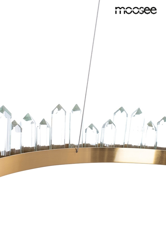 Lampa wisząca NENUFAR od marki MOOSEE. Elegancką konstrukcję wykonano z połączenia stali nierdzewnej i szklanych kryształów. Ledowe źródło światła umieszczone na całym okręgu, rozświetla kryształy, tworząc świetlne refleksy o ciepłej barwie. Okrągły kształt lampy, połączenie złota i kryształów zapewniają wyjątkowe oświetlenie pomieszczenia. Kompozycja z powodzeniem rozświetli wnętrze salonu, kuchni lub hotelowego lobby. Światło: LED 29 W / 2320 lm / 3000 K Oprawa: wys. 150 cm / szer. 60 cm / gł. 60 cm Klosz: wys. 26 cm / szer. 60 cm / gł. 60 cm Mocowanie: wys. 5 cm / śr. 15 cm Przewód: 140 cm Montaż: instalacja sufitowa Waga netto: 7,5 kg Wymiary opakowania: 65 cm / 65 cm / 12 cm.Cechy produktu