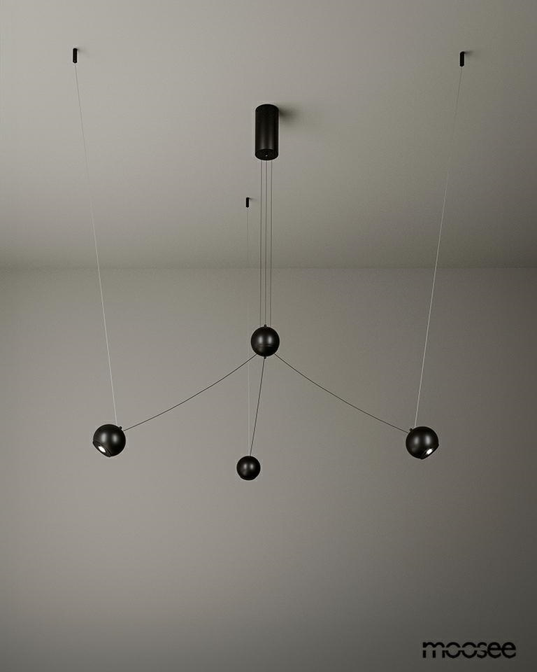 - MOOSEE lampa wisząca OCTO 3 czarna. Nowoczesne oświetlenie, które wyróżnia się minimalistycznym i eleganckim designem. Wykonanie z aluminium w czarnym matowym wykończeniu łączy trwałość z estetyką. Konstrukcja opiera się na trzech kulistych kloszach, zawi