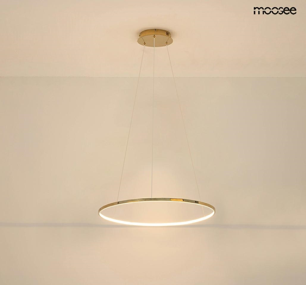 - MOOSEE lampa wisząca RING SLIM 60 złota Elegancka i nowoczesna oprawa wisząca, która ozdobi nie jedno wnętrze. Ponadczasowy i minimalistyczny design zawarto w okrągłej formie wykonanej ze stali w błyszczącym złotym kolorze. W zestawie dołączony jest pilot