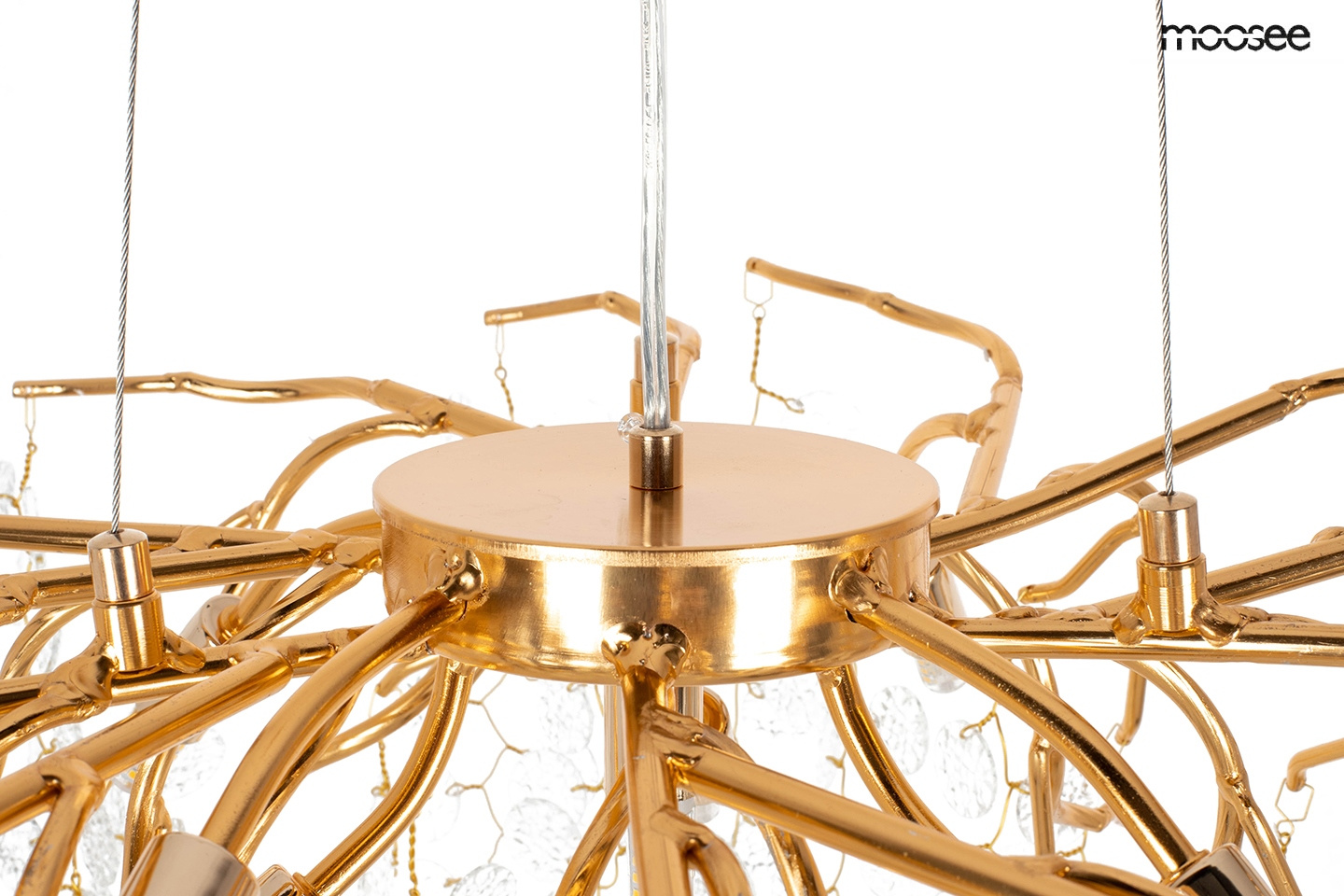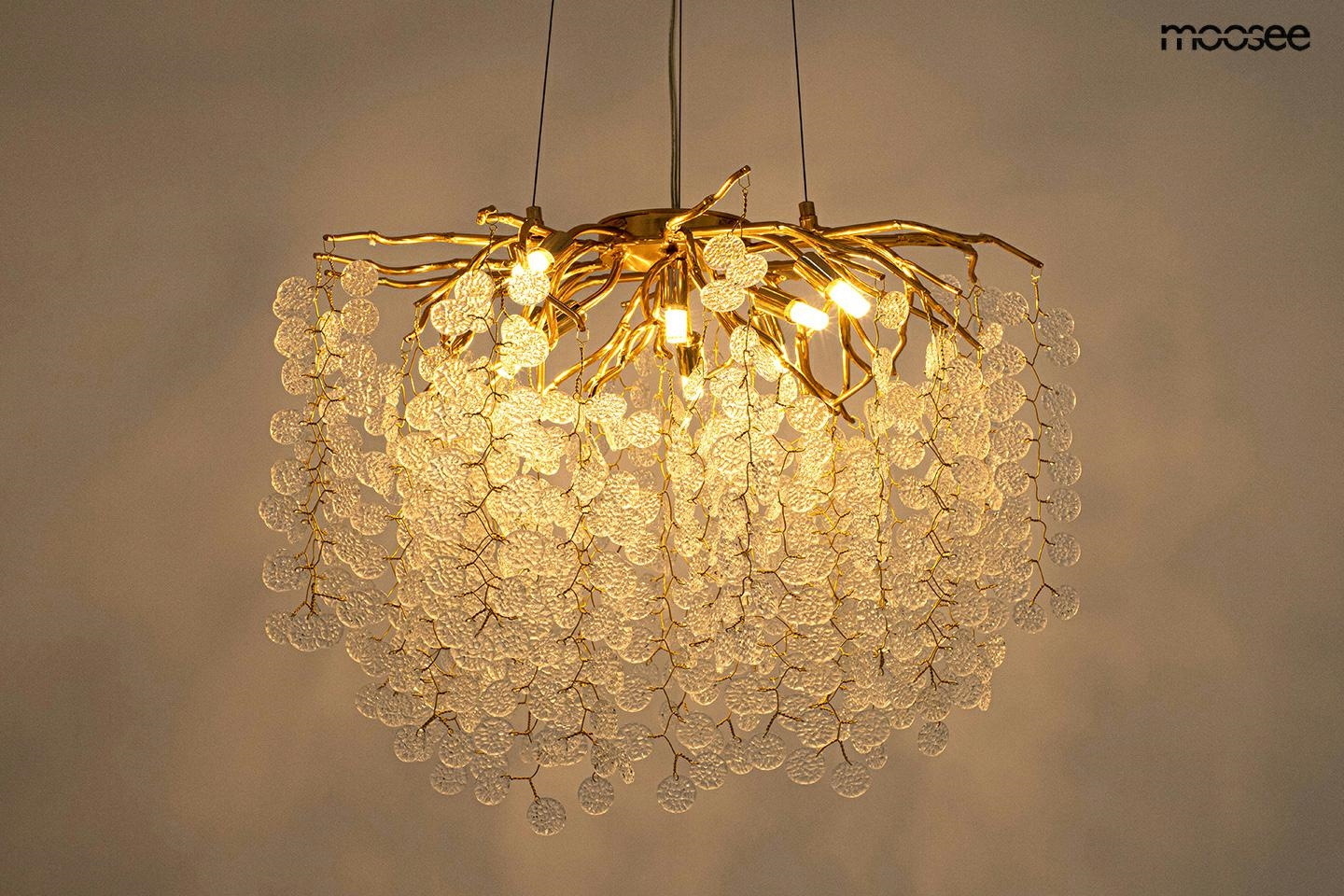 - MOOSEE lampa wisząca RIVIERA 80 złota / clear. Ekskluzywna i niecodzienna oprawa, która udekoruje Twoje wnętrze. Zbiór wykonanych z pełną precyzją akrylowych kloszy zamontowano na stalowej obręczy w kolorze złotym, imitującej gałęzie drzewa. Wśród przezro
