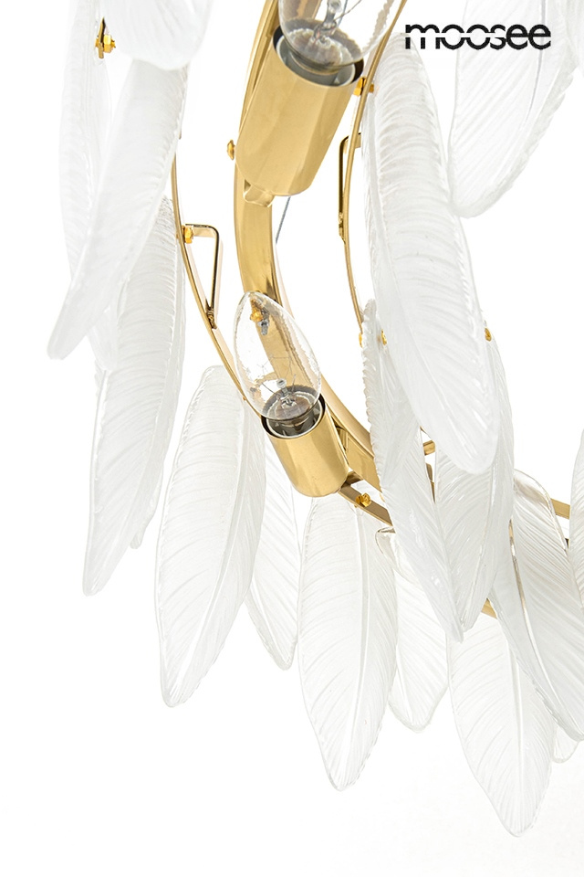 MOOSEE lampa wisząca ROCH 60 złota. Niezwykle elegancka propozycja oświetlenia, które zachwyca swoim wyrafinowanym designem. Subtelnego uroku dodają mleczne szklane klosze przypominające liście. Całość umieszczono na eleganckim stelażu wykończonym w złotym kolorze, który dopełnia luksusowego charakteru. Dostępność różnych rozmiarów pozwala dostosować lampę do każdego pomieszczenia. Światło: 8 x E14 max. 40 W / 220 V (brak w zestawie) Oprawa: wys. 195 cm / szer. 60 cm / gł. 60 cm Klosz: wys. 25 cm / śr. 60 cm Piórko: wys. 18,5 cm / szer. 8,5 cm / gł. 1 cm Mocowanie: wys. 3,5 cm / śr. 12 cm Przewód: 170 cm Wymiary opakowania: 66 cm / 66 cm / 22 cm Waga netto: 9 kg.Cechy produktu
