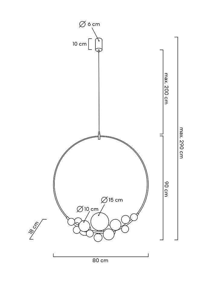MOOSEE lampa wisząca ROCIO czarna. Niezwykła propozycja nowoczesnego oświetlenia. Białe, szklane klosze skupione na dole metalowego okręgu tworzą elegancką kompozycję. 14 punktów świetlnych zapewni optymalne oświetlenie, a całość z powodzeniem udekoruje każde wnętrze. Na kloszu mogą wystąpić pęcherzyki powietrza, które są naturalnym efektem ręcznej obróbki szkła. Światło: 14 x G9 max. 5 W (brak w zestawie) Oprawa: wys. 290 cm / szer. 80 cm / gł. 18 cm Klosz: wys. 90 / szer. 80 cm/ gł. 18 cm Szklane klosze: śr. 5 x 6 cm, 3 x 7 cm, 5 x 10 cm, 1 x 15 cm Mocowanie: śr. 6 cm / wys. 10 cm Przewód: 200 cm Montaż: instalacja sufitowa Waga netto: 2,8 kg Wymiary opakowania: 90 cm / 85 cm / 22,5 cm.